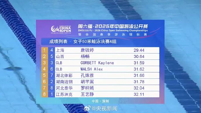 在2026中国游泳公开赛的女子50米蛙泳决赛中,唐钱婷以29秒44的成绩再次刷新自己今天刚刚打破的亚洲纪录,获得冠军。