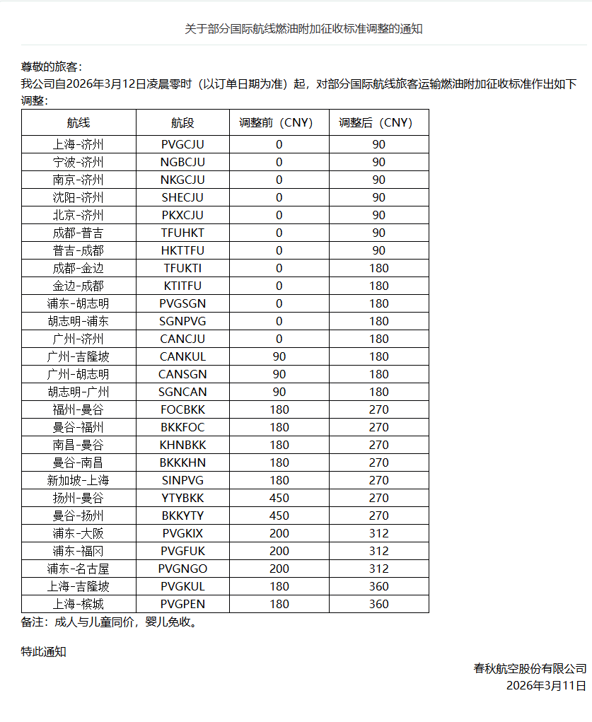 春秋航空从3月12日凌晨零时(以订单日期为准)起,上调了部分国际航线燃油附加费,涉及国内多座城市往返韩国、日本、越南、泰国、马来西亚、柬埔寨等东亚及东南亚航线。其中,成都—普吉航线燃油附加费由0元上调至90元,成都—金边航线燃油附加费由0元上调至180元。