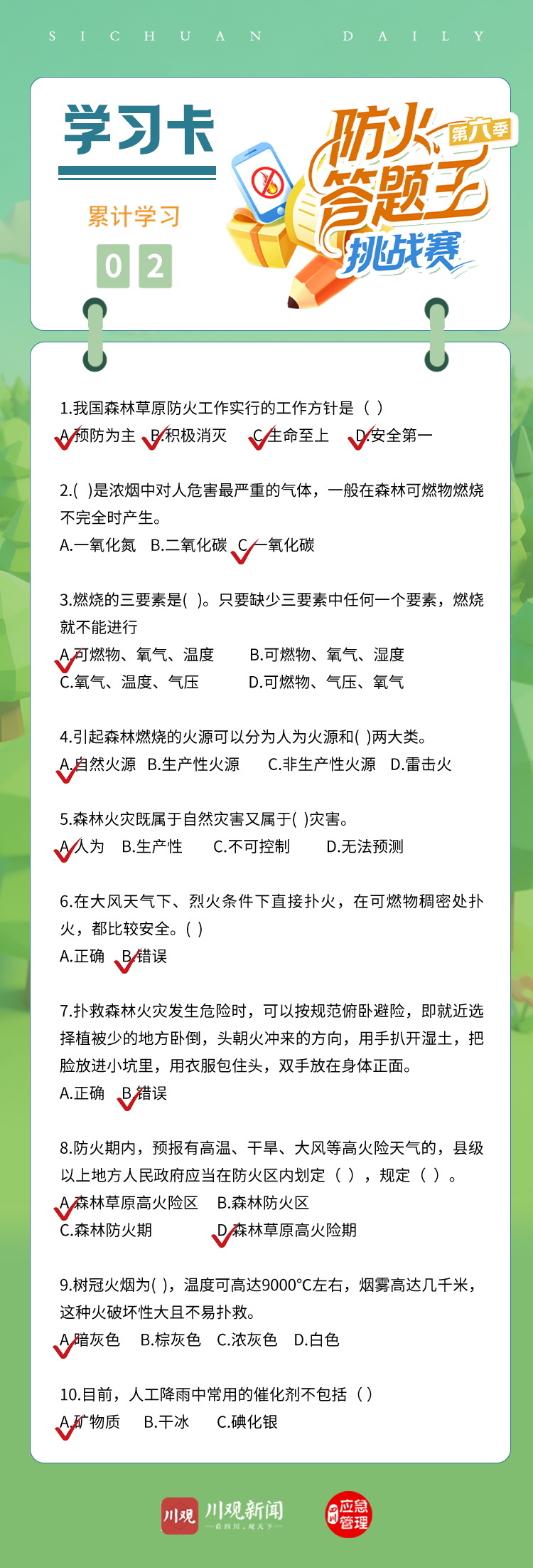 森林草原防火关键期,备考答题不迷路!川观“漏题王”准时上线,10道核心考题纯干货直接抱走!从我国森林草原防火工作方针,到燃烧三要素、浓烟危害气体、火源分类等考点,全覆盖划重点,帮你精准拿捏知识点!森林防火无小事,每一个知识点都是守护绿色家园的屏障,快收藏本期学习卡,跟着川观一起学起来!