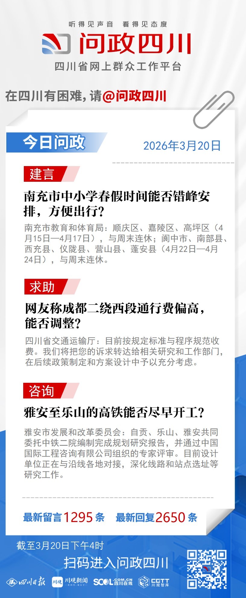 在四川有困难,找问政四川。如果您在四川遇到了操心事、烦心事、揪心事,请登录“四川省网上群众工作平台—问政四川”或拨打问政四川热线(028-96001)留言反映、求助或建议。我们将充分发挥平台的互动联系作用及舆论监督功能,第一时间传递民声,推动问题得以及时解决——听得见声音,看得见态度。