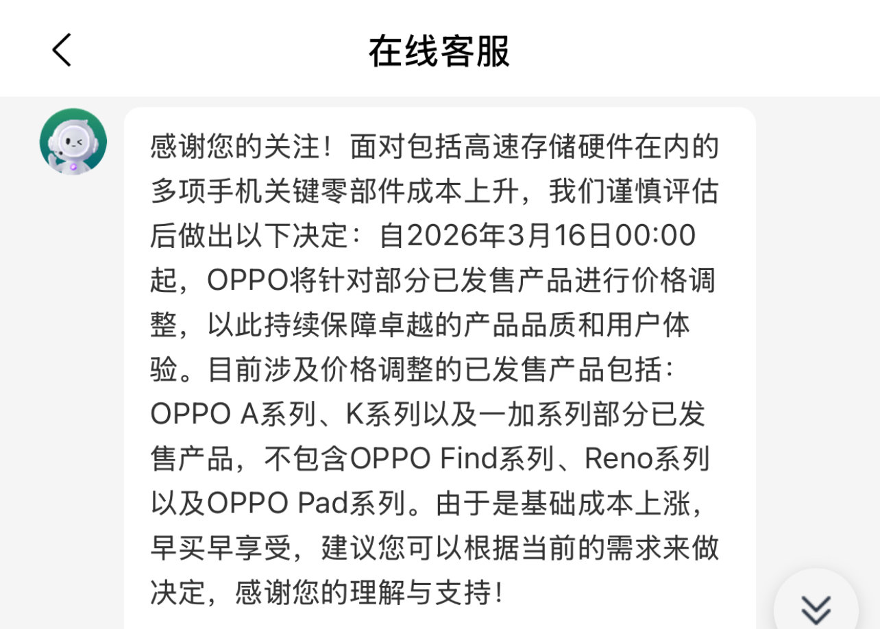 近日,OPPO发布公告,宣布自3月16日0:00起,对部分已发售产品进行价格调整,包括OPPO A系列、K系列,以及一加系列。