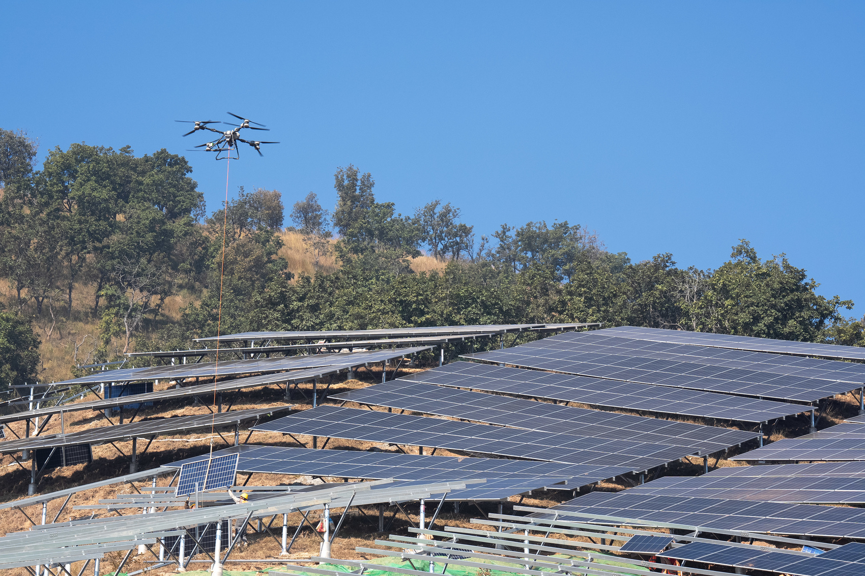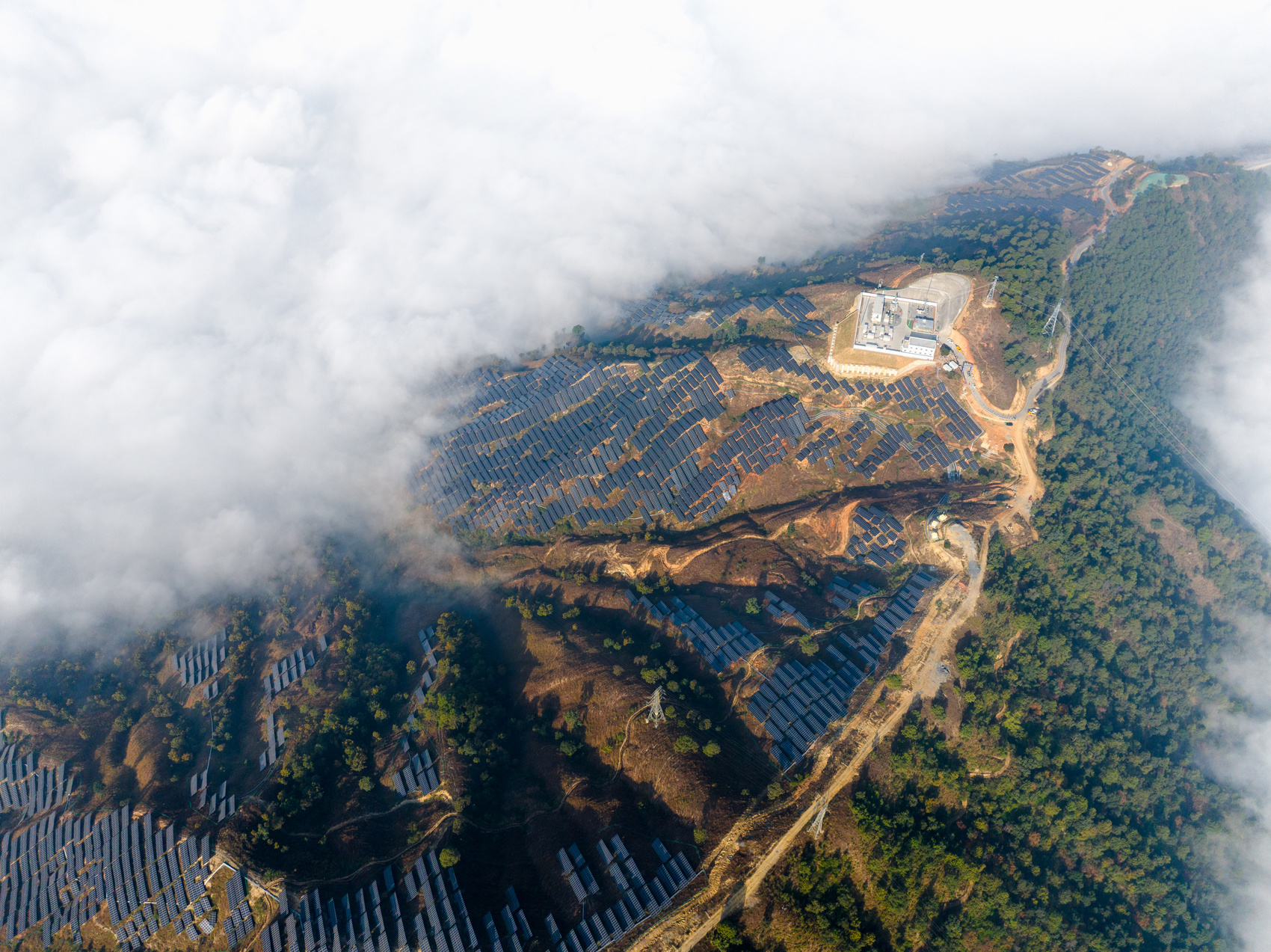 该项目团队还在设计方案上不断“挤”空间。针对山地光伏特点,团队通过提高陡坡区域布板比例,30度以上陡坡区域利用率超过65%,其中40度以上陡坡区域利用率超过20%,有效拓展了可安装空间。同时,围栏拐角等零散边角地块也被充分利用,小组串灵活布置,实现“能装尽装”。通过一系列设计创新举措,在装机规模不受影响的前提下,项目37个方阵累计节约用地200余亩。