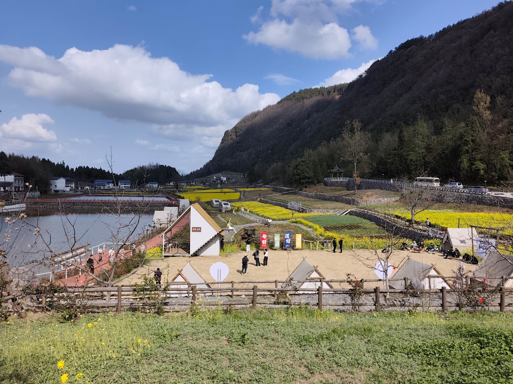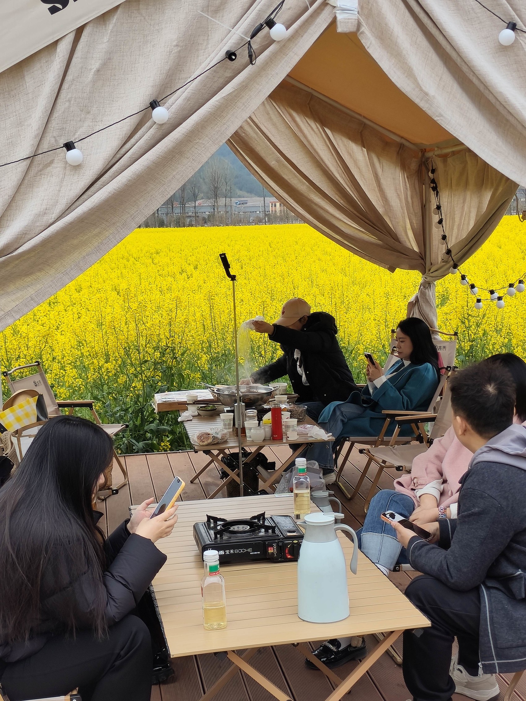更让人眼前一亮的是,油菜花丛中临时搭设了一个个帐篷,在帐篷里可以涮火锅、吃烤肉。这正是羊木镇东山村集体经济新的增收点。