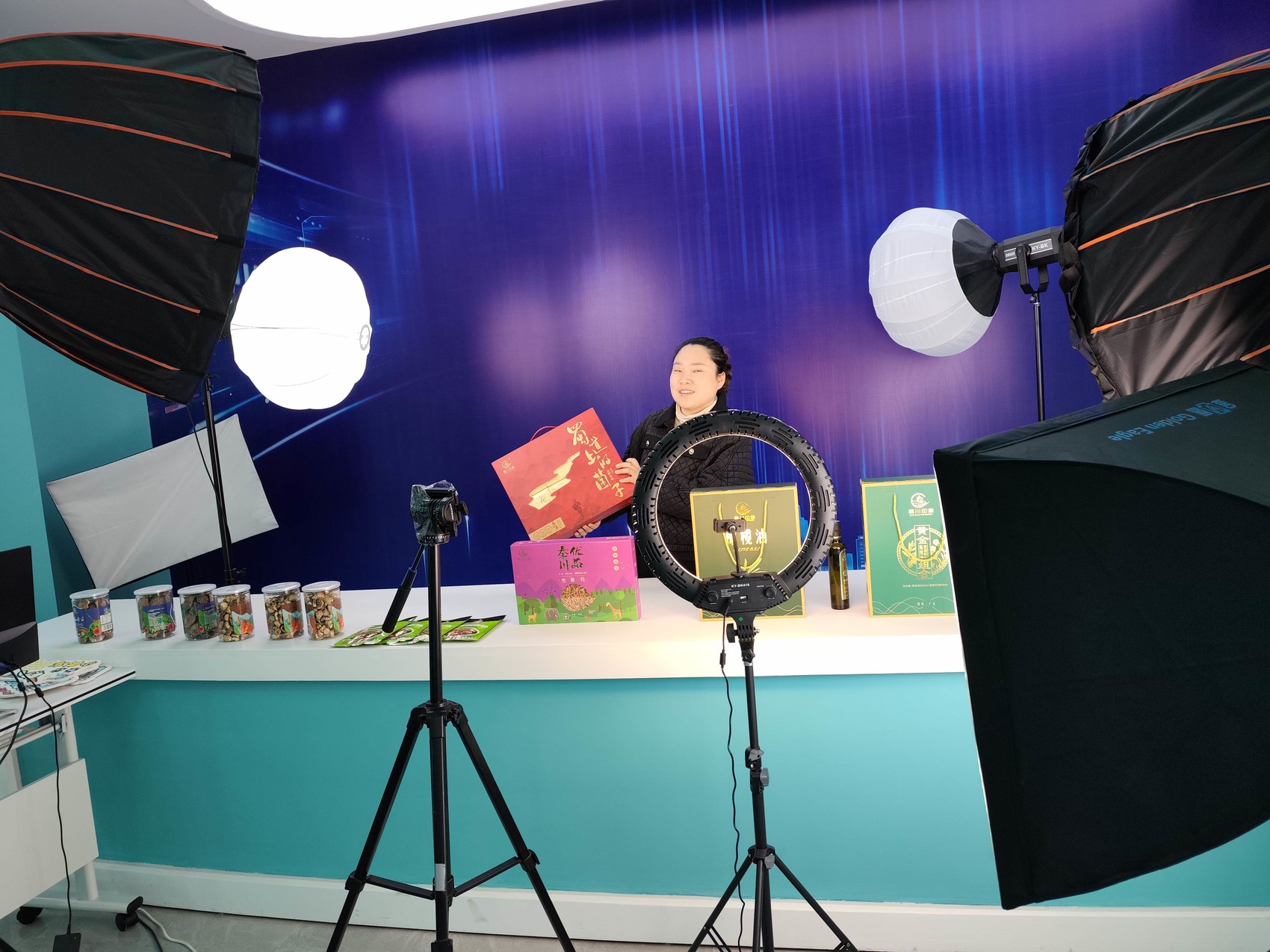 在朝天区中子镇,由广元秦川印象生态农业开发有限公司承接运营的朝天七盘关电商直播基地,展陈着核桃油、食用菌等当地特色农产品。这些农产品通过电商直播走向全国各地。