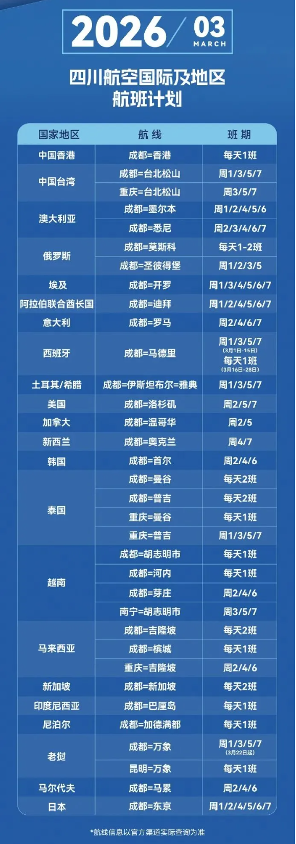 3月29日,我国民航运输正式执行夏秋航季航班计划。在民航换季前,成都国际航线将上新。