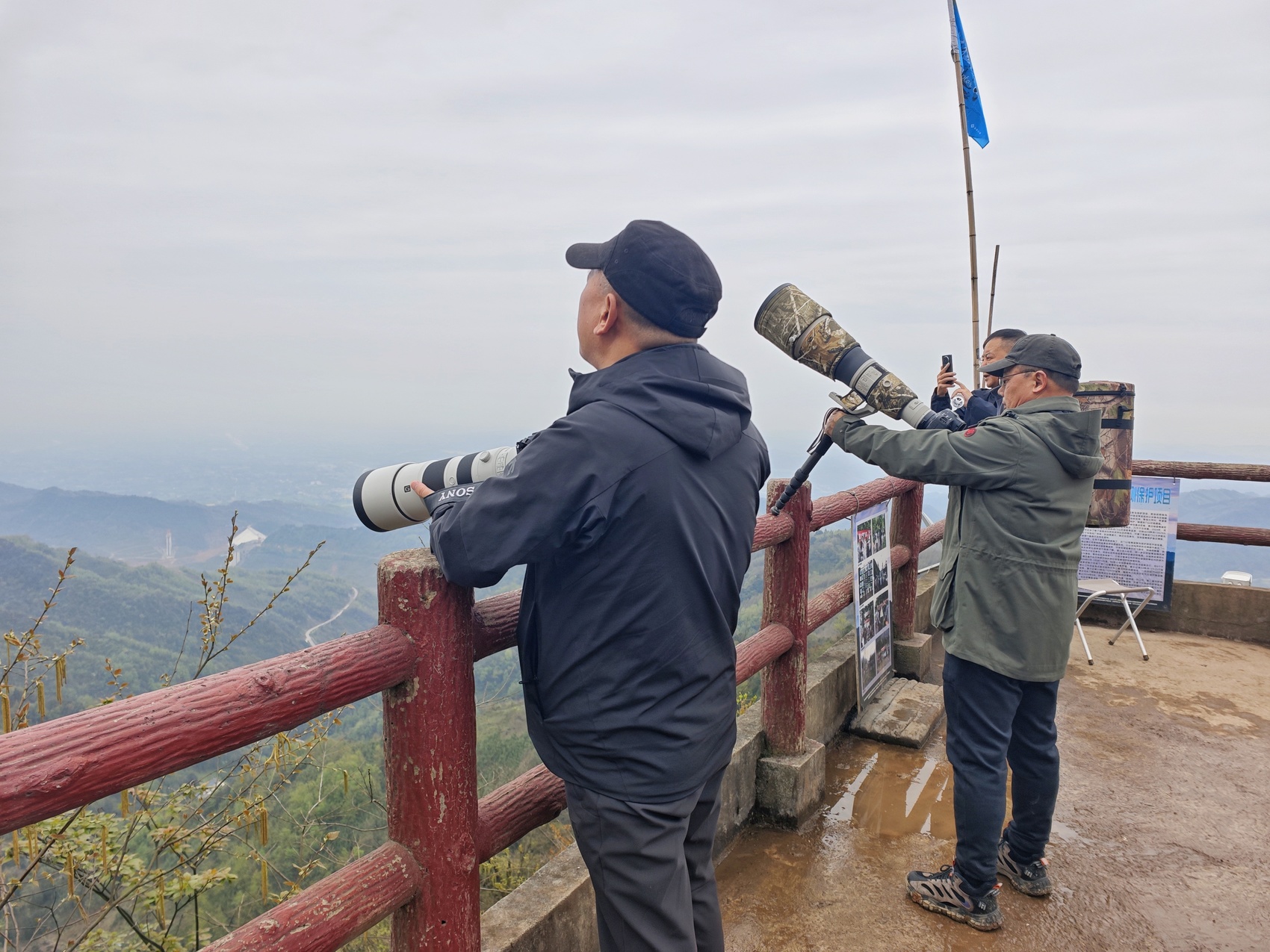 观鸟爱好者在崇州市文井江镇大坪村都统岩猛禽监测点观鸟。杨都 摄