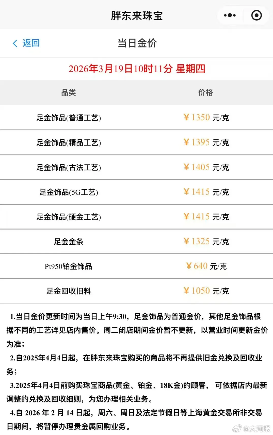 大河报记者了解到,胖东来足金饰品1315元/克,较于昨日1350元/克下跌35元/克;胖东来足金金条1265元/克,较于昨日1325元/克下跌60元/克。