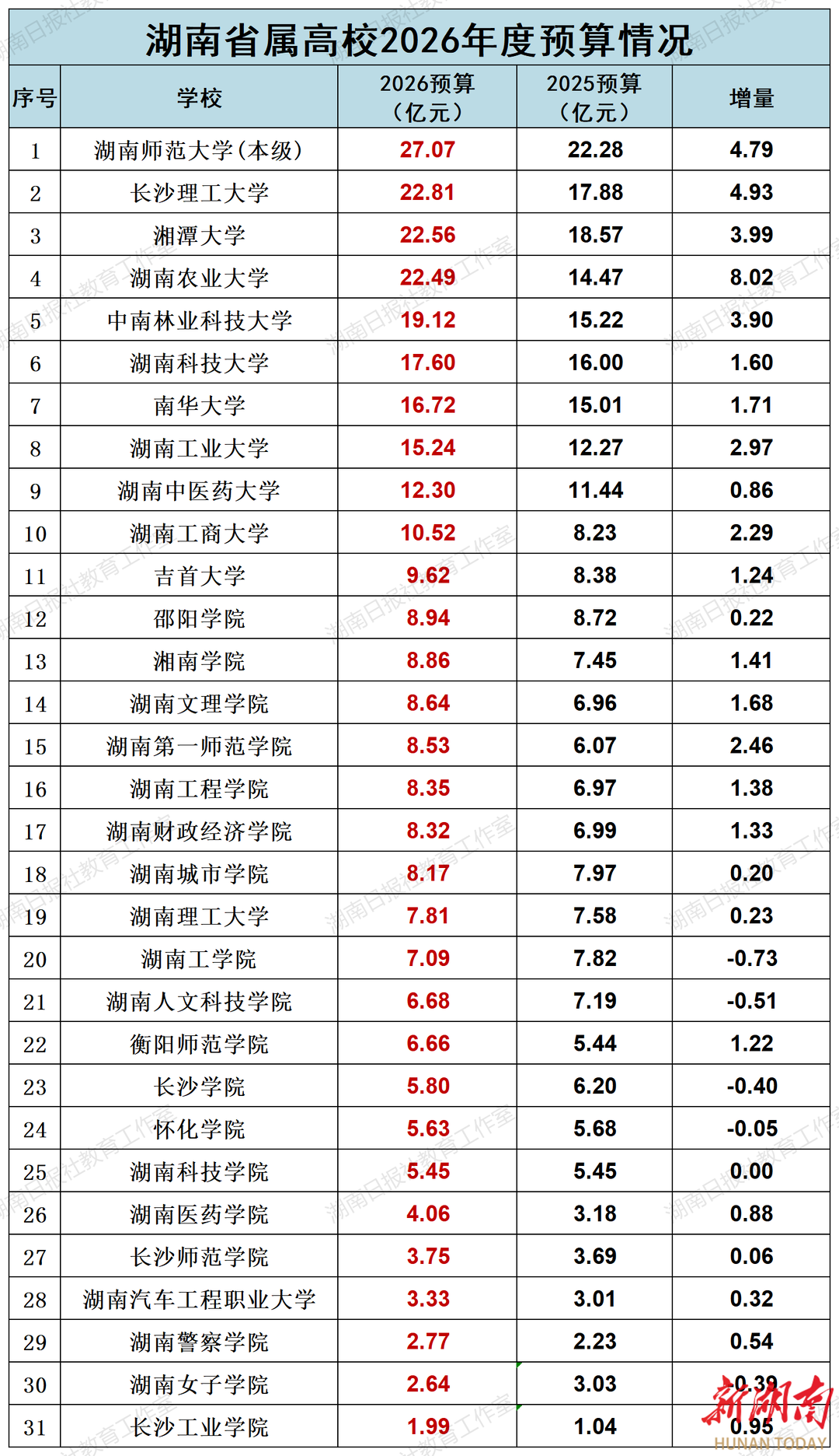 近日,湖南省教育厅公布2026年省属高校经费预算数据。数据显示,经费保障力度持续加大,预算总额较去年实现显著增长,经费分配更趋优化,高等教育发展活力进一步激发。其中,10所院校年度预算突破10亿元,较去年增加1所;4所院校迈入20亿元梯队,打破此前湖南师范大学一枝独秀的格局。