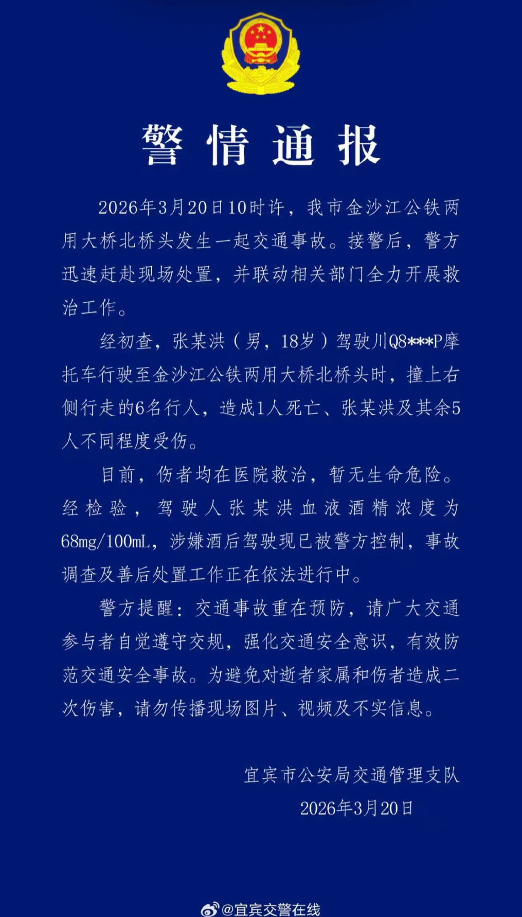 经初查,张某洪(男,18岁)驾驶川Q8***P摩托车行驶至金沙江公铁两用大桥北桥头时,撞上右侧行走的6名行人,造成1人死亡、张某洪及其余5人不同程度受伤。目前,伤者均在医院救治,暂无生命危险。经检验,驾驶人张某洪血液酒精浓度为68mg/100ml,涉嫌酒后驾驶现已被警方控制,事故调查及善后处置工作正在依法进行中。