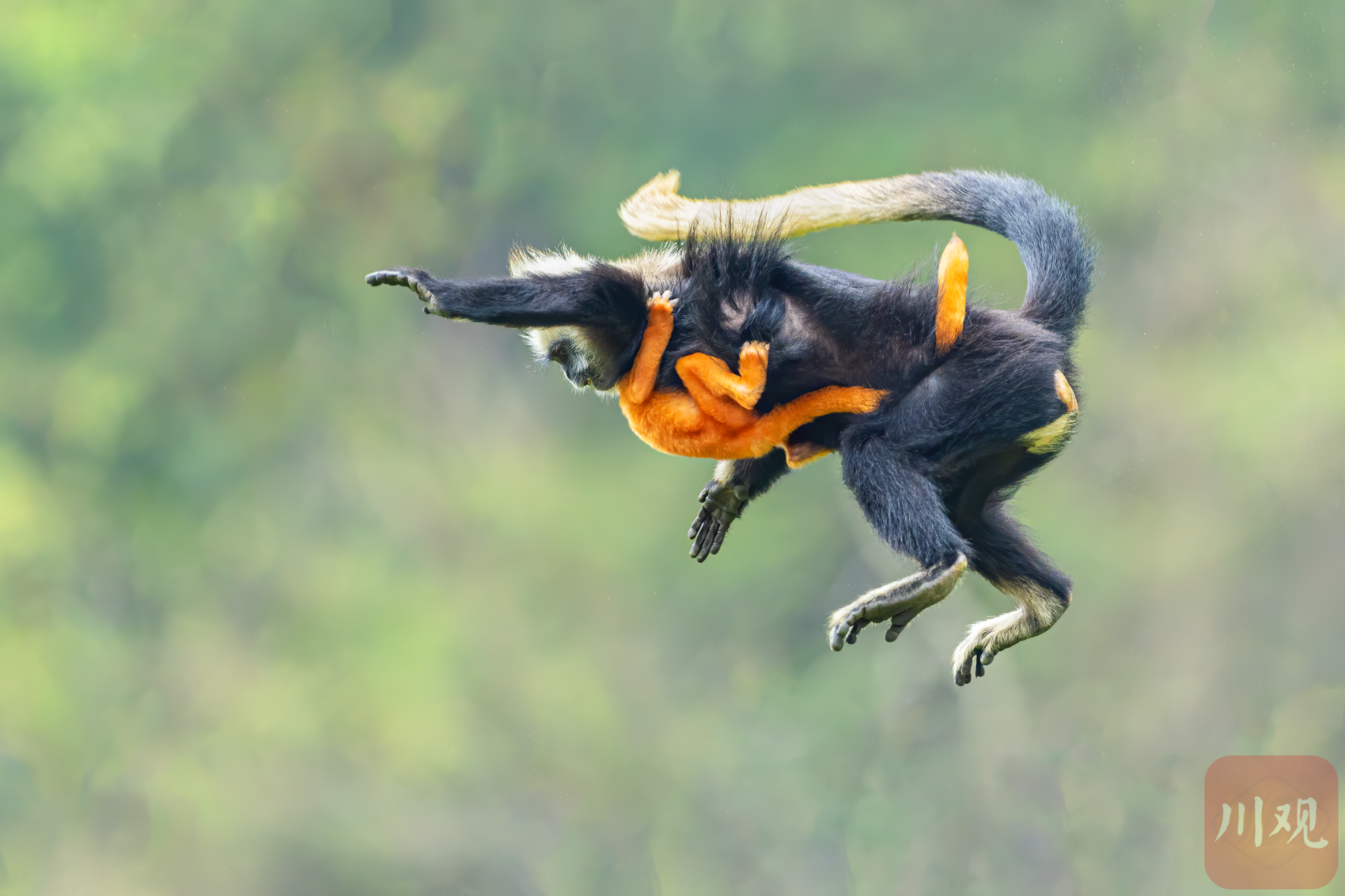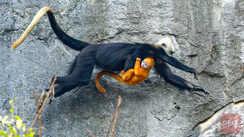 岩壁之间,白头叶猴妈妈带着幼崽飞身跃过。