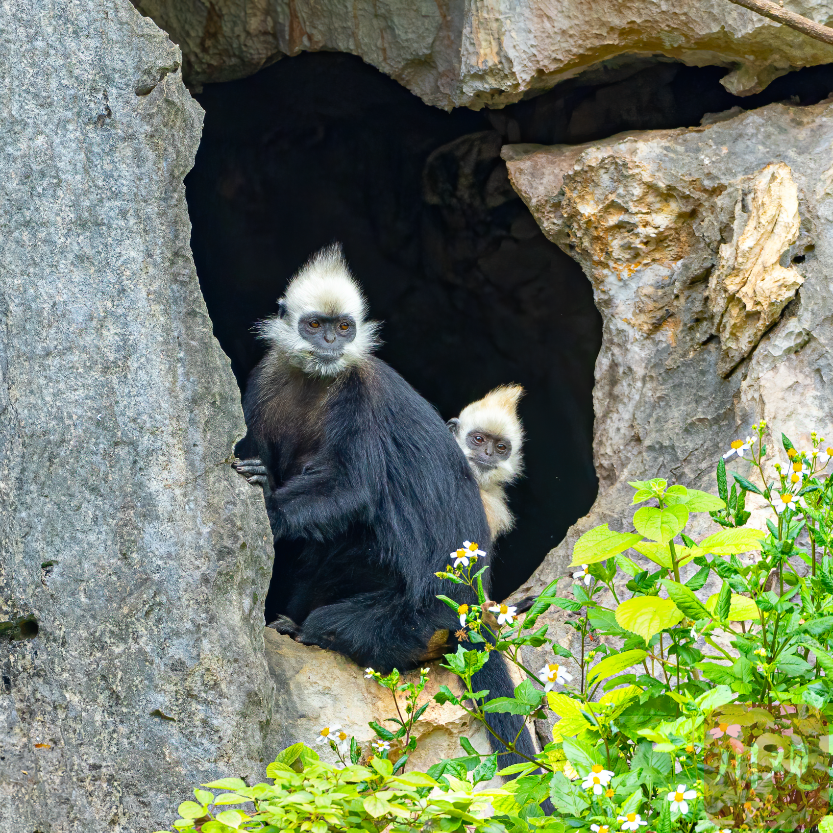洞口前,两只白头叶猴探身张望,像是在春光里悄悄“打量”外面的世界。