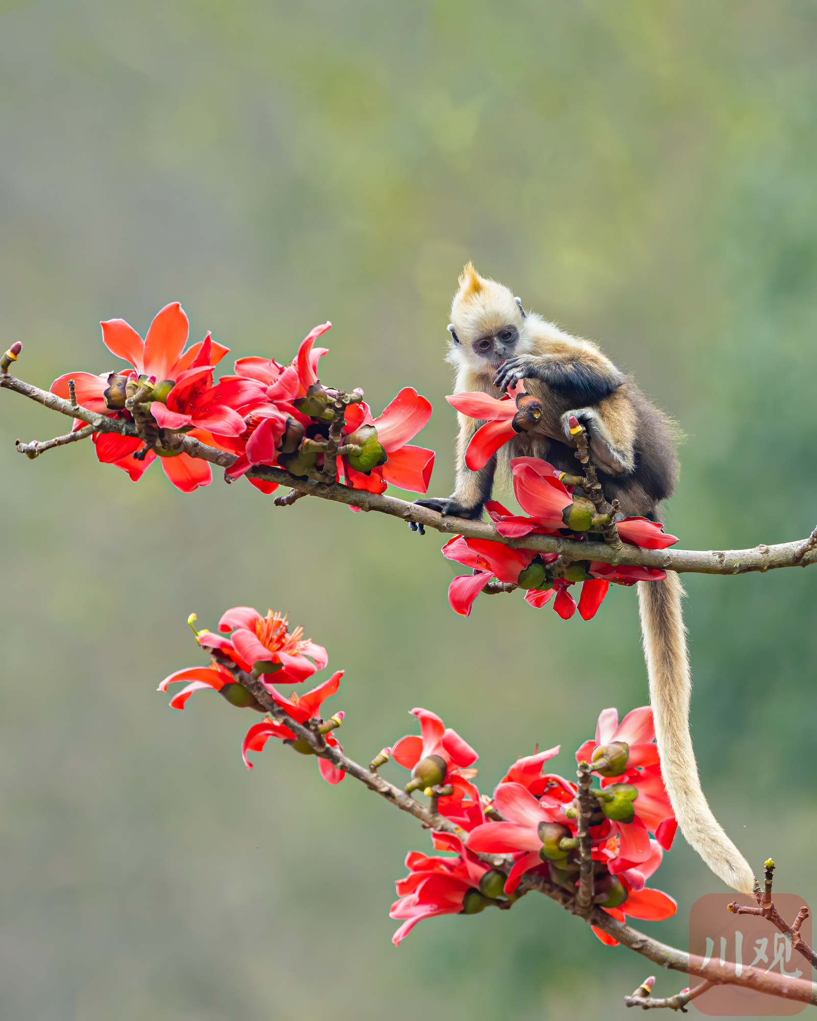 木棉花开正艳,一只白头叶猴幼崽蹲坐枝头“赏花”,火红花瓣映着金黄绒毛,春日气息扑面而来。