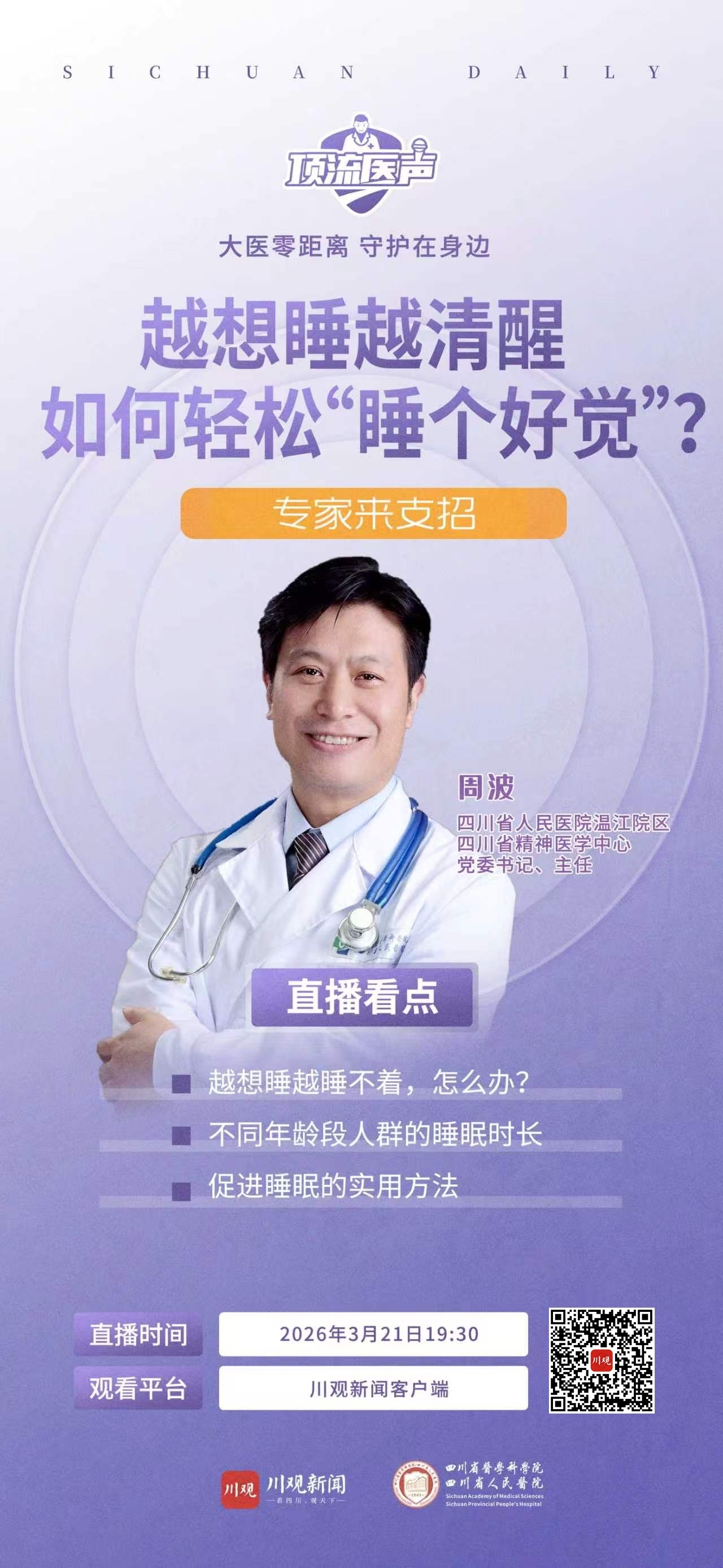 3月21日是世界睡眠日,川观新闻特别邀请到四川省人民医院温江院区/四川省精神医学中心专家做客“顶流医声”直播间,帮大家科学拆解睡眠难题,走出睡眠焦虑,找回好睡眠。