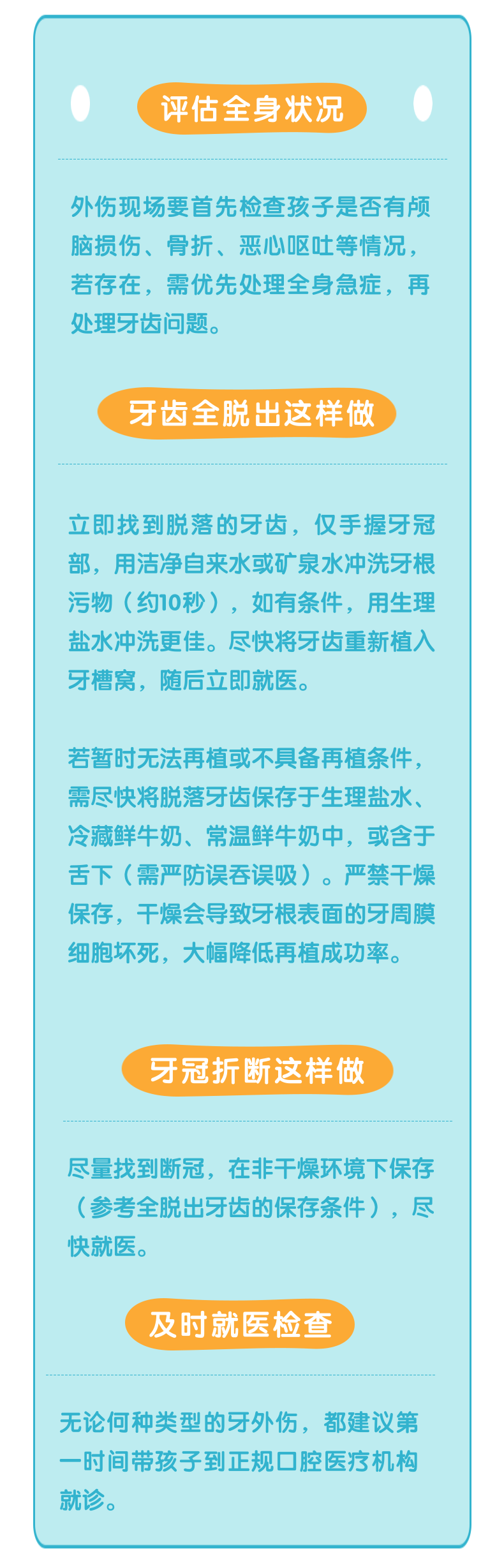 牙外伤的现场处理,直接影响牙齿的预后,尤其是牙齿全脱出的情况,再植越及时,预后越好。家长需牢记以下要点。