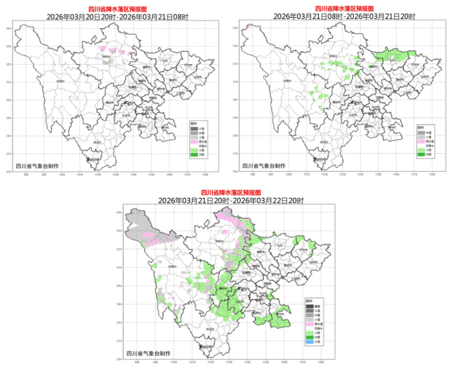 预计3月22日晚上到23日白天,盆地阴天间多云,部分地方有阵雨或小雨,个别地方中雨;川西高原阴天间多云,部分地方有阵雨或阵雪,局地中雪;凉山州北部阴天间多云有阵雨或阵雪,攀西地区其余地方多云。