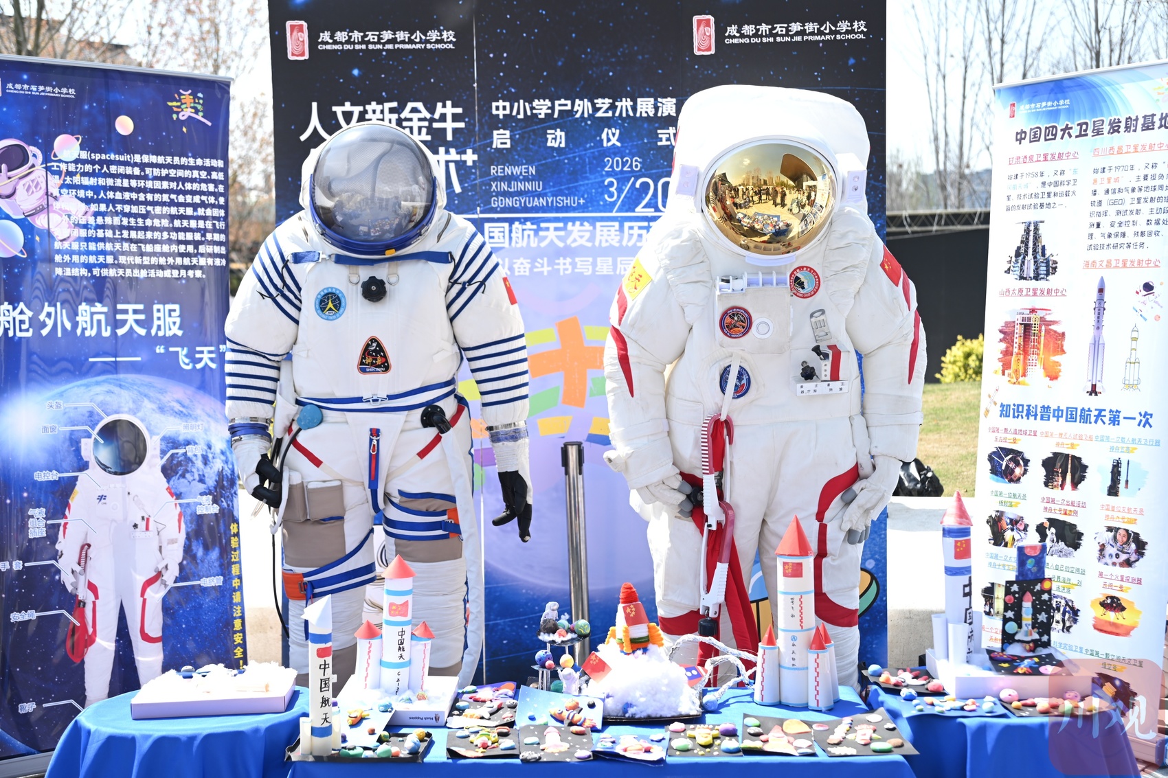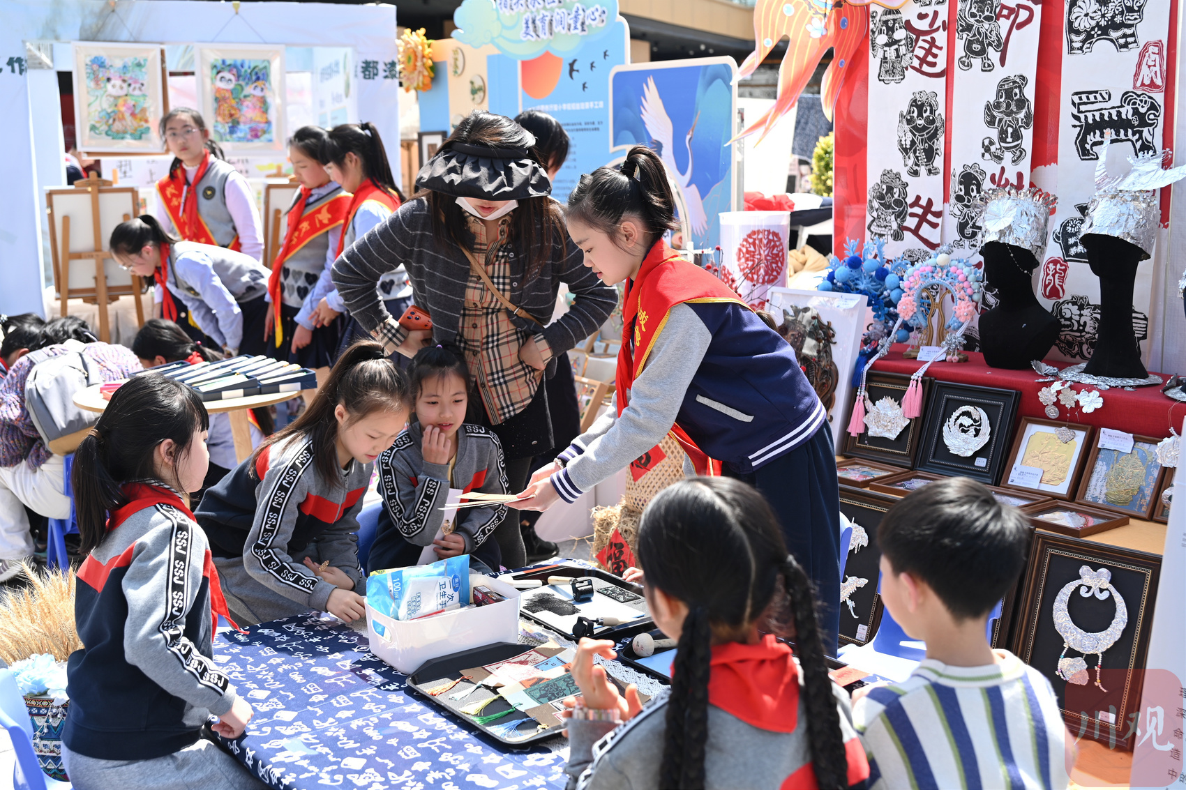 会场外,天府艺术公园湖滨广场上,非遗工坊与书画创作比邻而居,科创体验与传统体育相映成趣。“小匠人市集”更是热闹非凡,剪纸、糖画、长嘴壶……来自金牛区各中小学、幼儿园的孩子们,将各自学校的美育特色一一铺展,引得游人纷纷驻足。