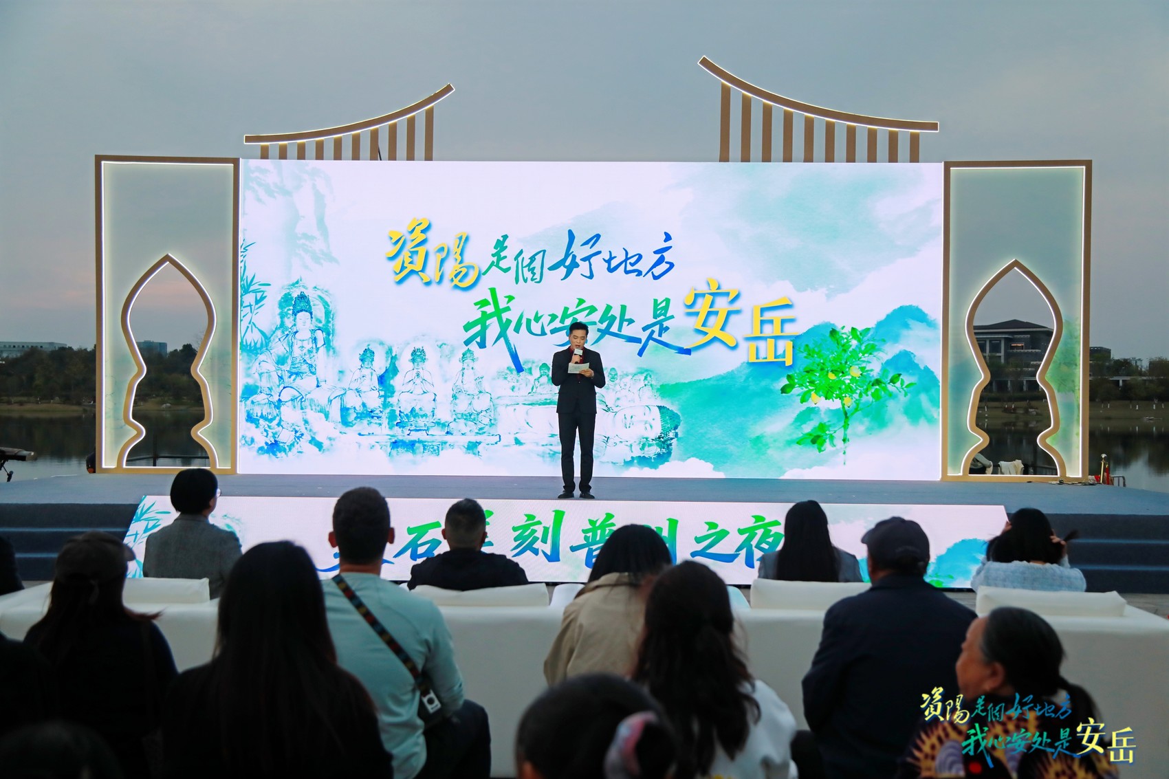 晚风轻拂,石窟千年。活动尾声,安岳文旅推介官廖玉霞、艺术家苏茂隆、国家级非遗代表性传承人石永恩共同登台,向全场发出诚挚邀约:“安岳永远欢迎您。”
