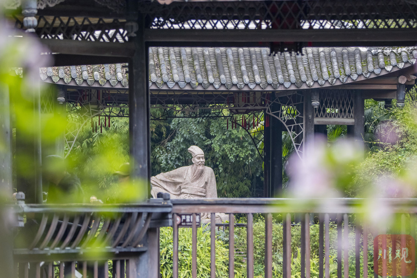 眉山市东坡区三苏祠瑞莲亭畔,东坡盘陀雕塑若隐若现,古建与繁花相映成趣。视觉签约摄影师 李继军