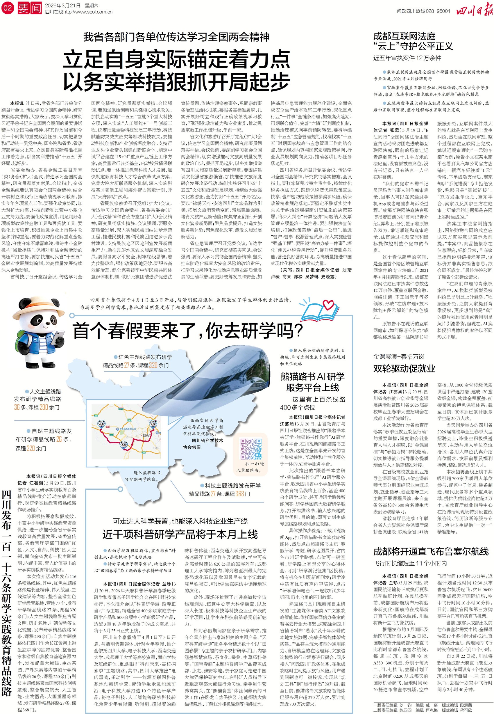 3月20日,四川发布116条研学精品线路,红色、人文、自然、科技四大主题全覆盖,配套课程超过千门。想打卡长征遗址、探秘古蜀文明、看大熊猫撒欢、走进大科学装置或科技企业生产线?统统安排!