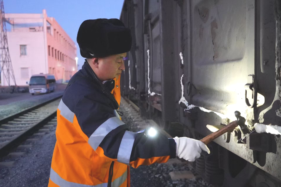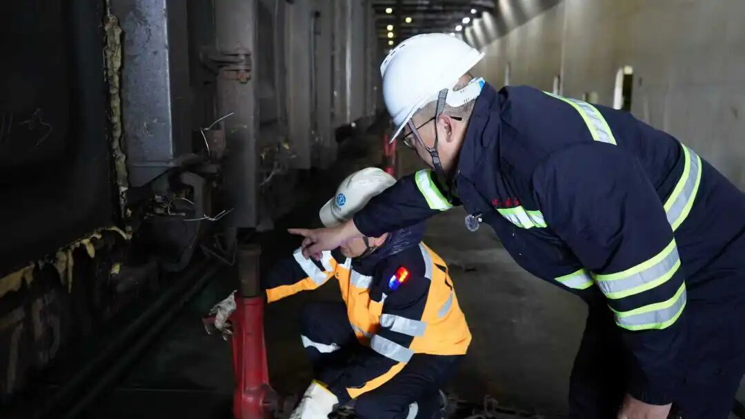 宋世刚的职责就是为这趟列车做一次全面“体检”,逐一检查车轮、车厢、轴承等关键部位。全长300多米的列车,一节车厢就有十多处关键部位需要检查,他要在半小时内完成全部的检修工作。