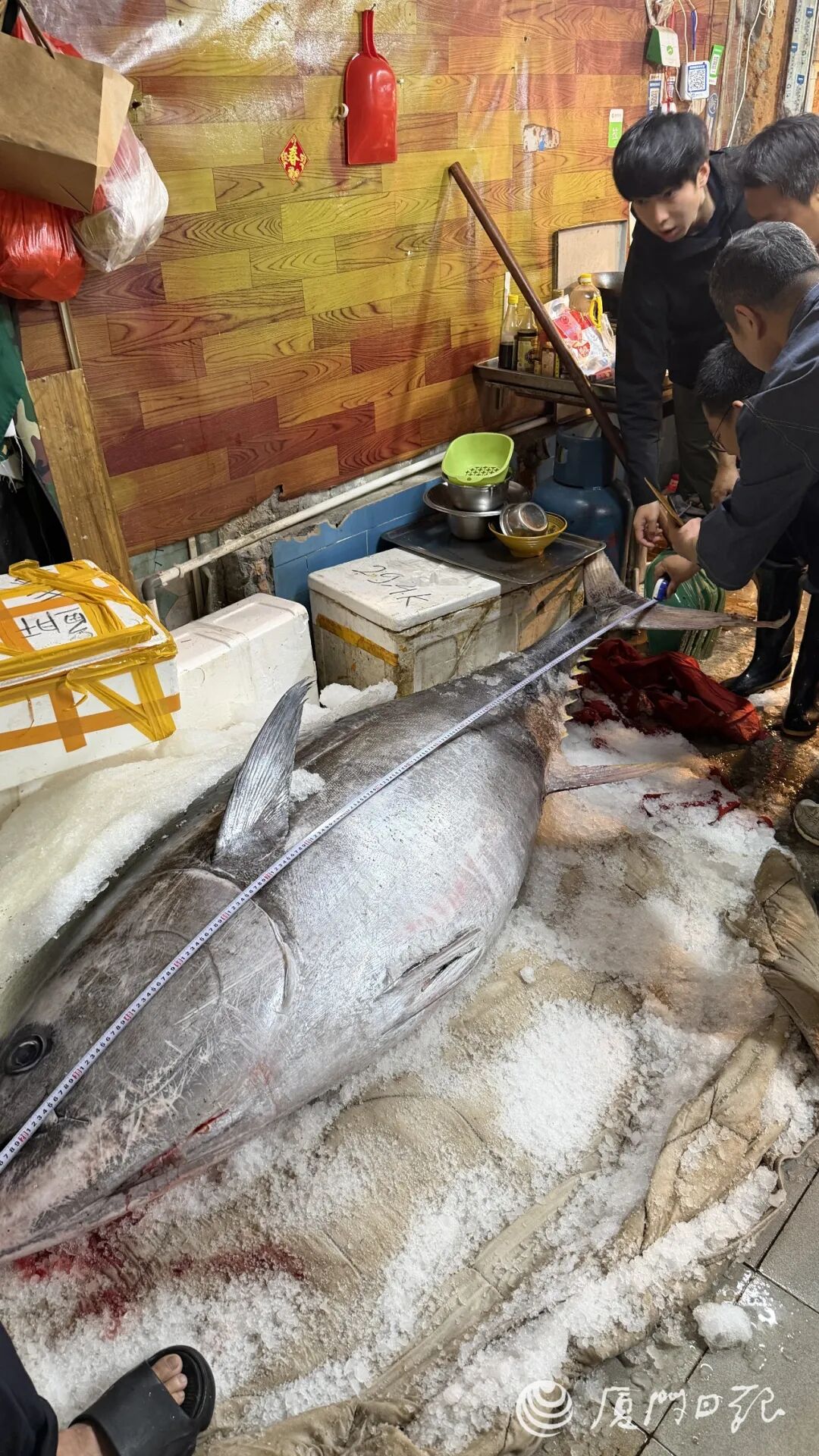 这条巨无霸蓝鳍金枪鱼需要两人协作处理鱼肉。