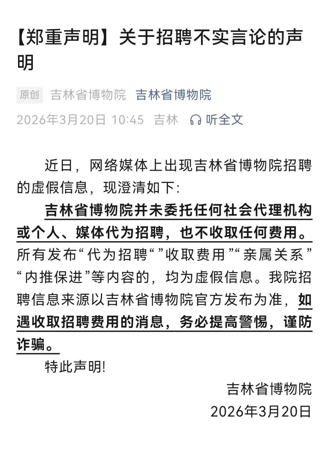 3月20日,吉林省博物院关于招聘不实言论发布郑重声明,内容如下: