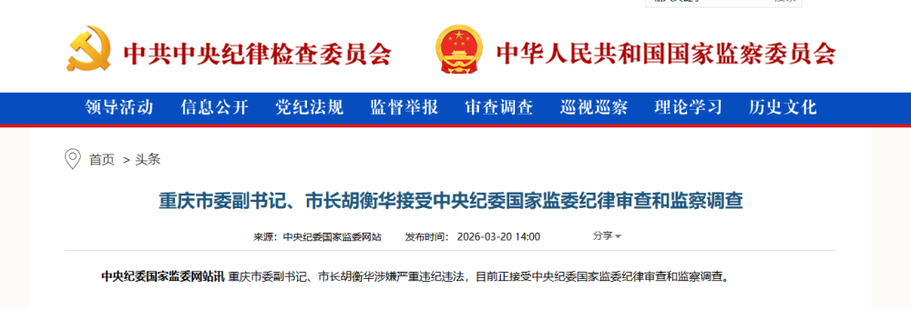 重庆市委副书记、市长胡衡华涉嫌严重违纪违法,目前正接受中央纪委国家监委纪律审查和监察调查。