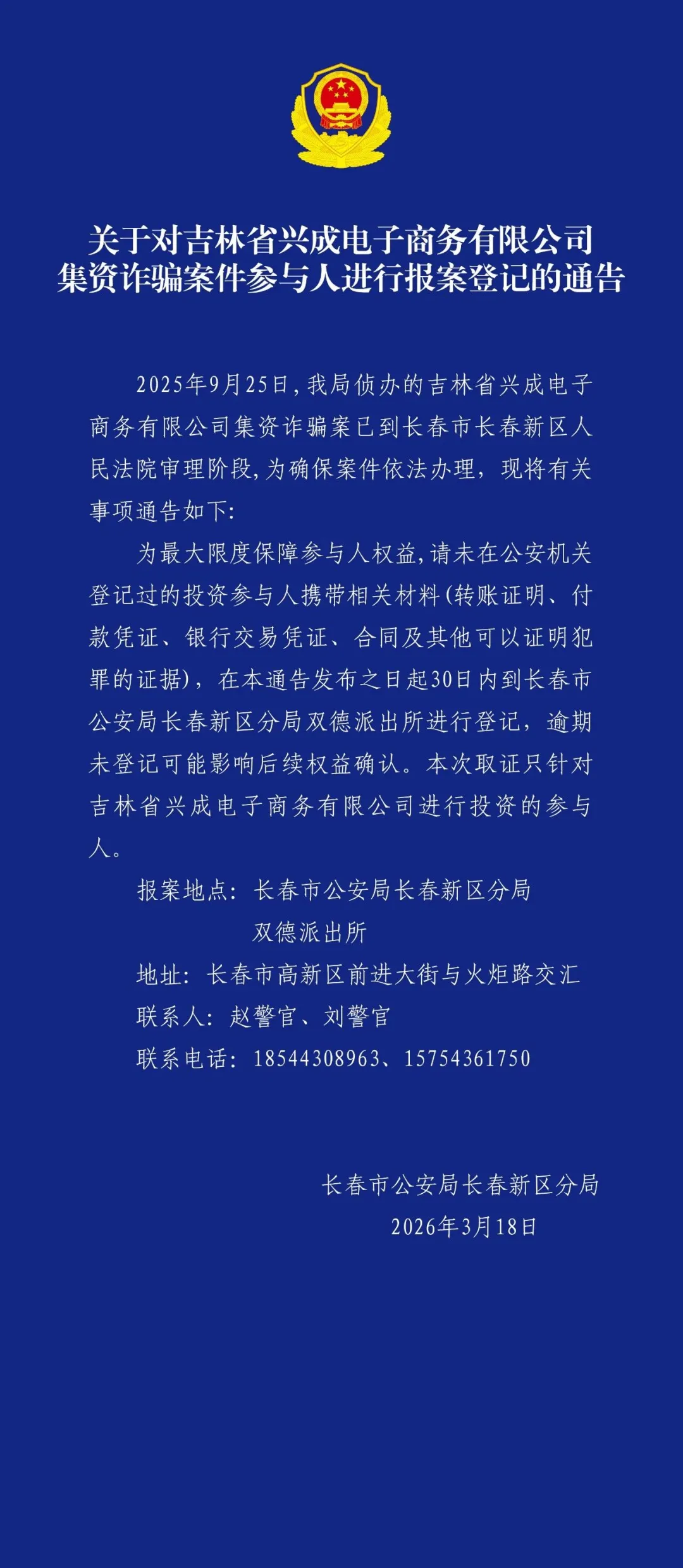 原文标题:关于对吉林省兴成电子商务有限公司集资诈骗案件参与人进行报案登记的通告