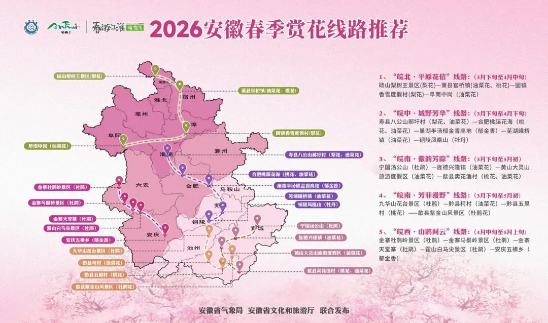 安徽省气象局、安徽省文化和旅游厅联合推出2026年安徽春季赏花线路推荐。