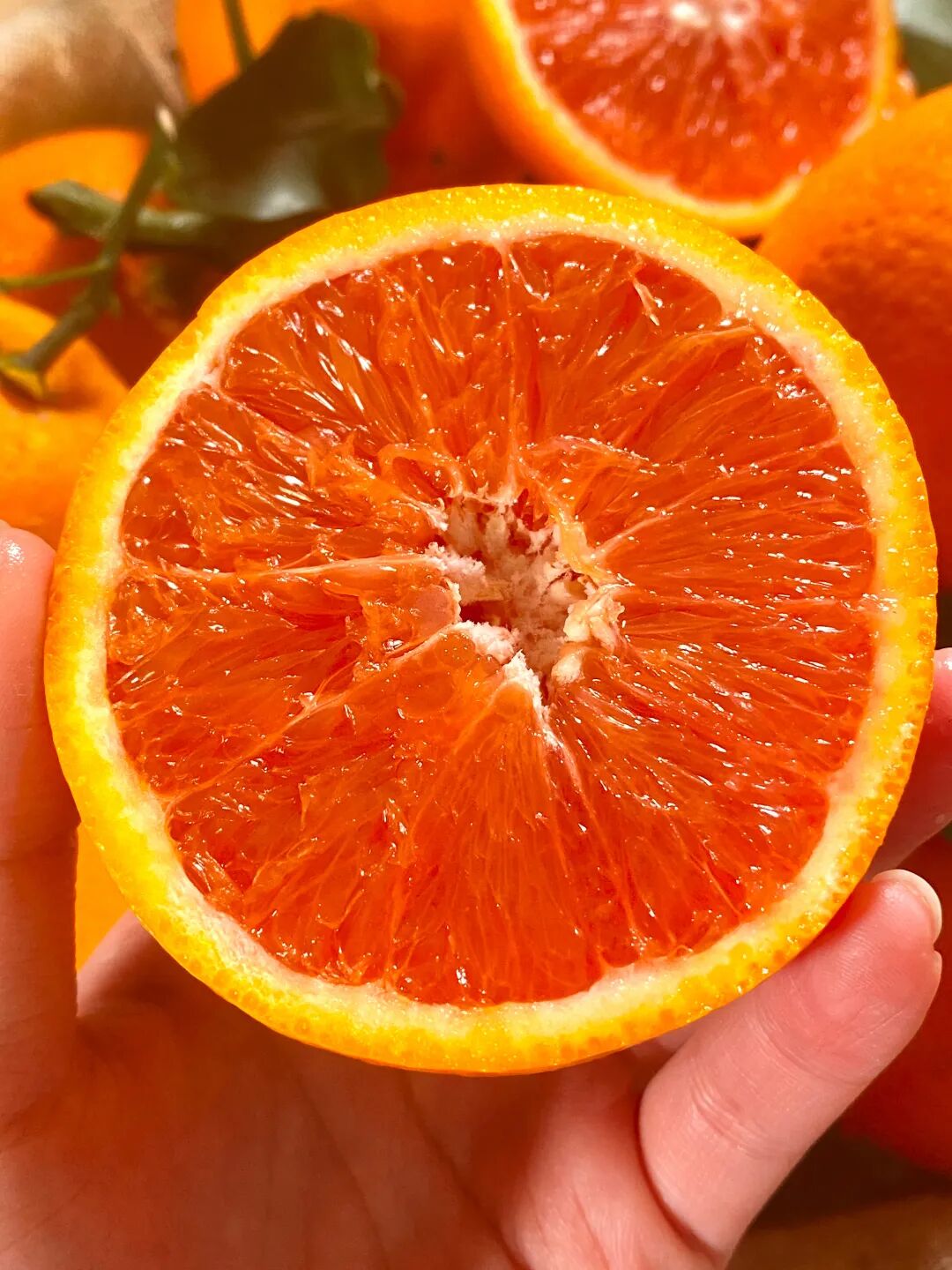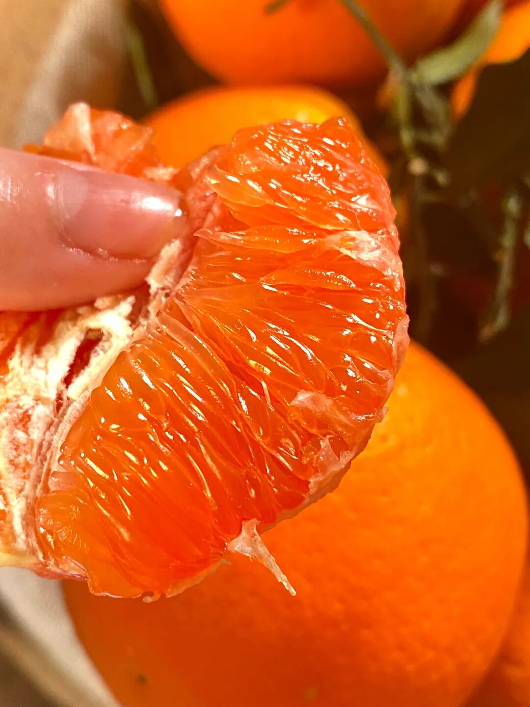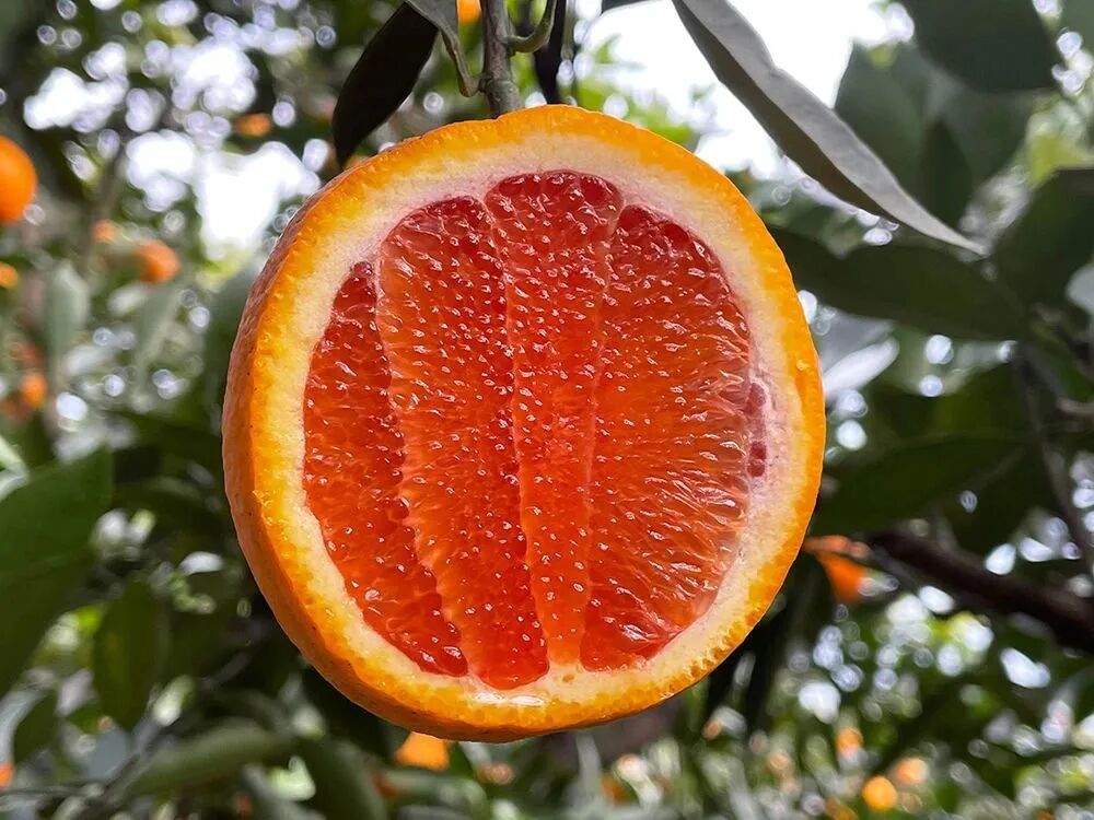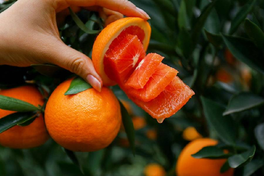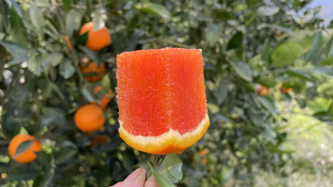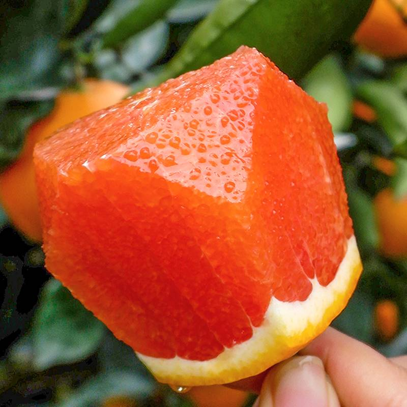 切开一颗中华红橙,白色的果膜包裹着玛瑙般艳红的果肉,在阳光下晶莹剔透,颜值超高,果肉 Q 弹爽滑得如同橙子味果冻,不管是直接鲜食、榨汁还是做水果餐,都格外合适。