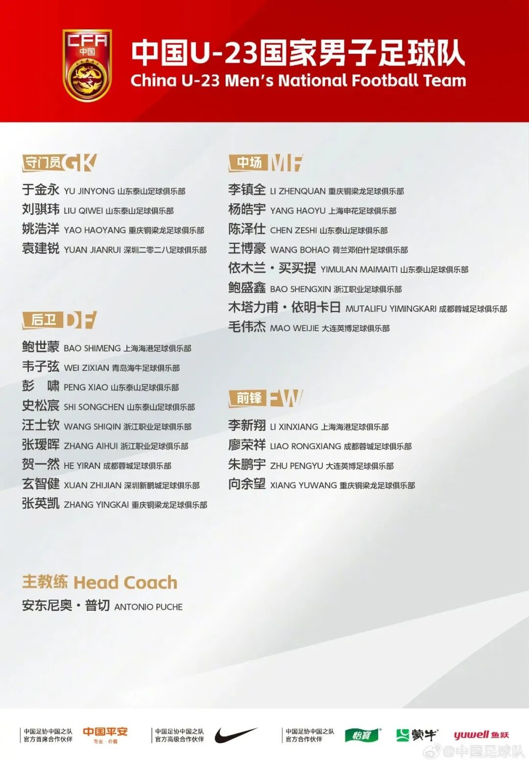 据足球报,记者获悉,李昊因伤落选。山东泰山6人入选成头号大户,此前跟随U23国足夺得U23亚洲杯亚军的球员中,共12人入选此份名单,汪士钦回归。