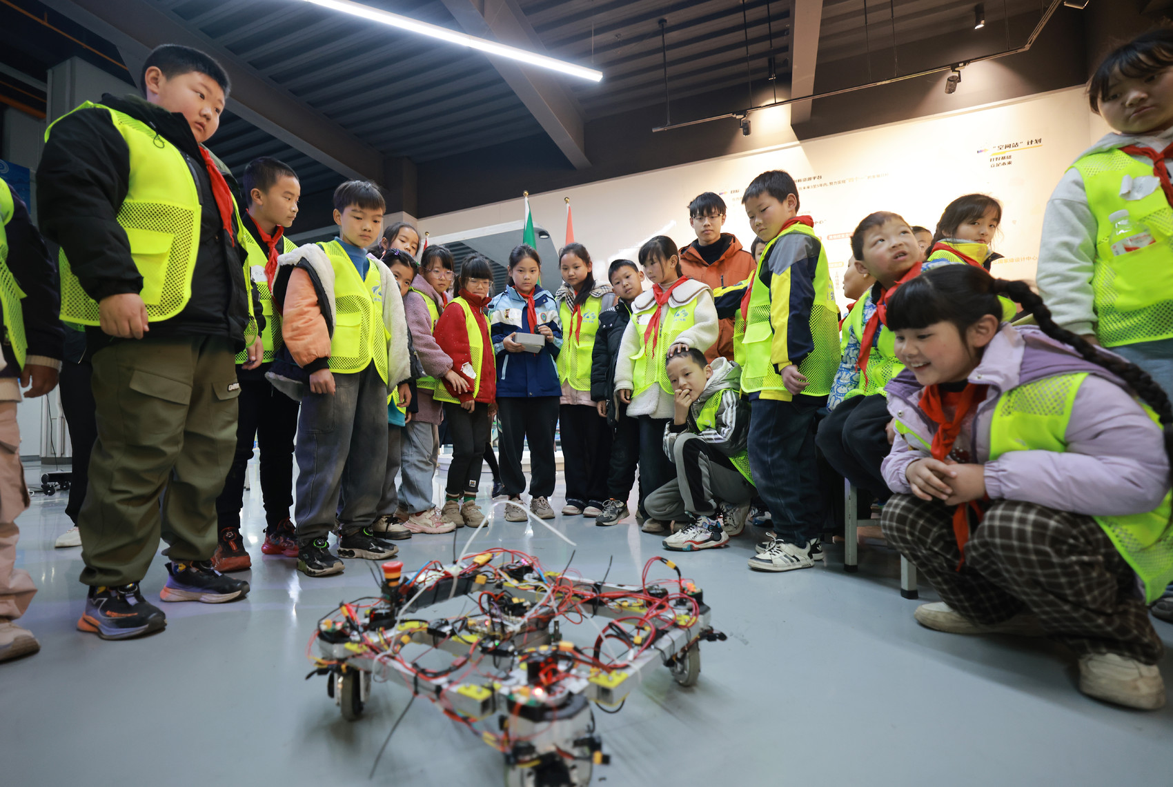 这些平日里鲜少接触前沿科技的乡村孩子,在沉浸式的看、听、学、做中,零距离感受科技魅力。研学首站,西南科技大学机器人实验室里形态各异的机器人瞬间点燃了他们的好奇心。大学生志愿者详细讲解了机器狗、投篮机器人的研发历程,孩子们听得入神,争相参与操作体验。“太神奇了!”仙鹤镇朝真小学四年级的张俊杰难掩激动,“我以后也想当科学家,用科技报国!”