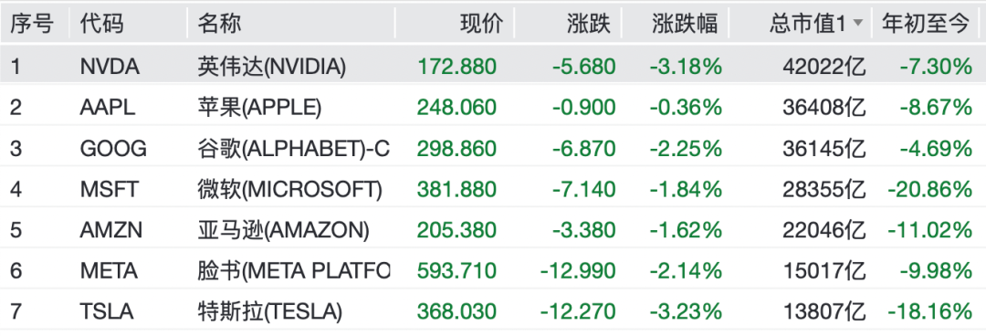 美国科技七巨头指数跌2.03%,特斯拉、英伟达跌超3%,谷歌、META跌超2%,亚马逊、微软跌超1%。