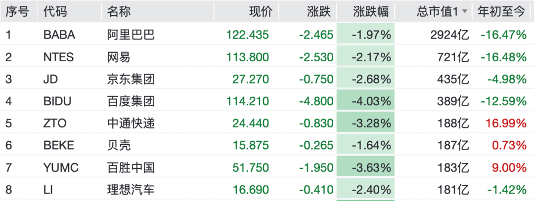 中概股多数下跌。纳斯达克中国金龙指数跌2.92%。热门中概股方面,小鹏汽车收跌8.25%,百度集团跌超4%,阿里巴巴跌近2%,京东集团跌2.68%。