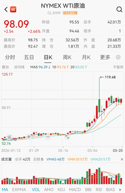 WTI原油最新报98.09美元/桶,日涨幅为2.66%。