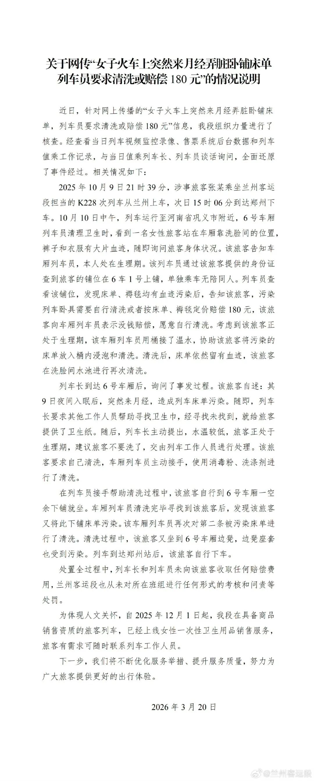 3月20日,兰州铁路局兰州客运段官方微博 @兰州客运段 发布情况说明:
