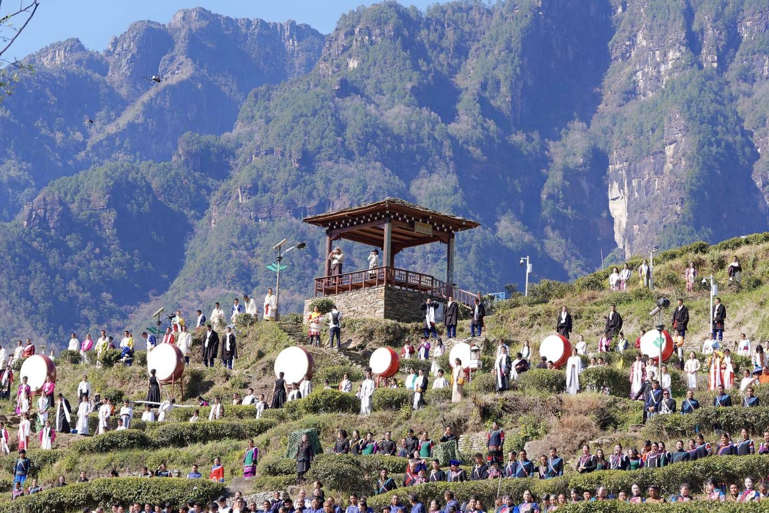 上午10时,天乡茶文化广场上,身着民族服装的群众面对连绵茶山“喊山祭茶”,寄托茶农对自然的敬畏与丰收的祈愿,也成为游客体验原生态文化的第一站。“我们希望通过沉浸式体验,让游客真正走进九龙的文化肌理。”九龙县文化广播电视和旅游局相关负责人介绍,从绒巴茶坊的非遗技艺展示、普米记忆的马帮文化体验,到翡池流云的民族时装秀,再到云上潮音的爵士乐跨界演绎,本次活动五大分会场各具巧思,传统与现代在此交融。