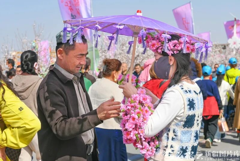 3月20日,在托克逊县夏镇南湖村,游客游园赏花。