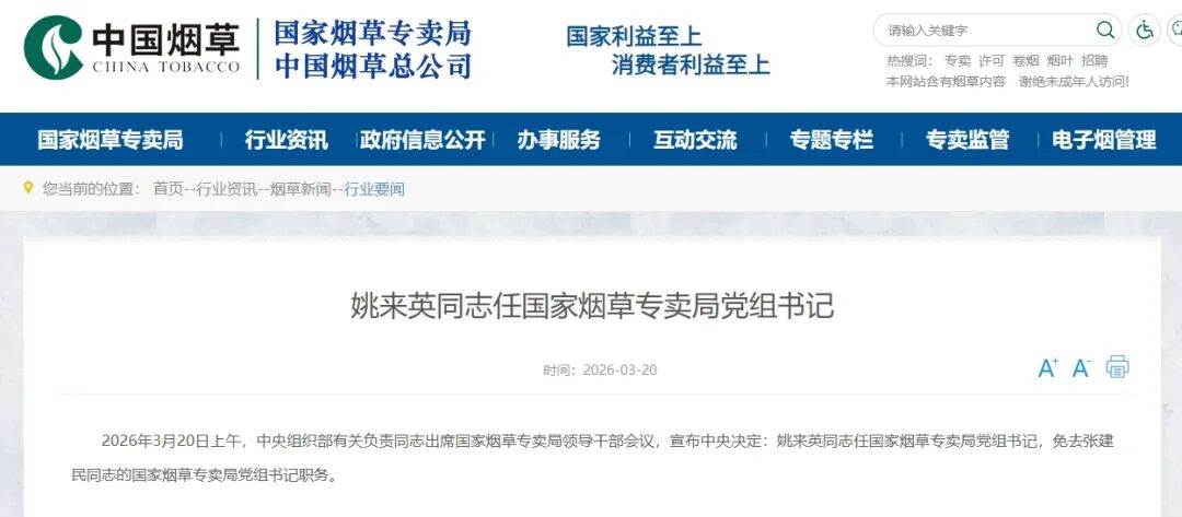 2026年3月20日上午,中央组织部有关负责同志出席国家烟草专卖局领导干部会议,宣布中央决定:姚来英同志任国家烟草专卖局党组书记,免去张建民同志的国家烟草专卖局党组书记职务。