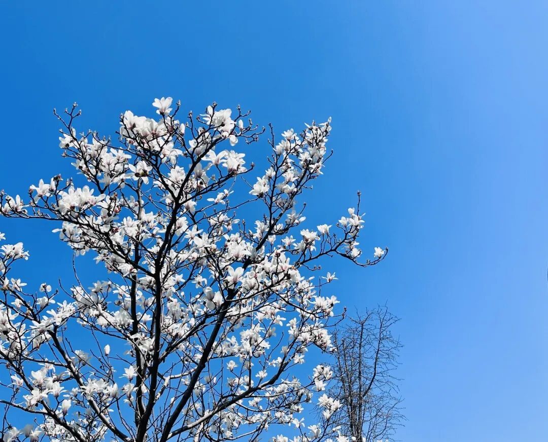 沿着河畔的人行步道修得齐整,春水初涨,泛着浅浅的绿。进入三月不久,远远便能望见几株花开正盛的玉兰立在河边,白的、粉的,疏疏朗朗地点缀着蓝天。它们身后衬着的不是园林的白墙黛瓦、街巷的市井烟火,而是流水、桥梁,与两岸错落的楼宇与天际线。再低头看向静静的河水,水波不兴,能清晰地看见玉兰的倒影,竟比真身还要多几分温柔。