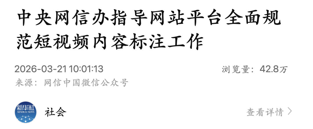 新华社3月21日消息,当前,网站平台关于短视频内容标注的标准和尺度不一,一些含有虚构演绎、摆拍营销、AI生成等内容的短视频未进行规范标注,严重误导公众认知,扰乱社会秩序,污染网络生态。