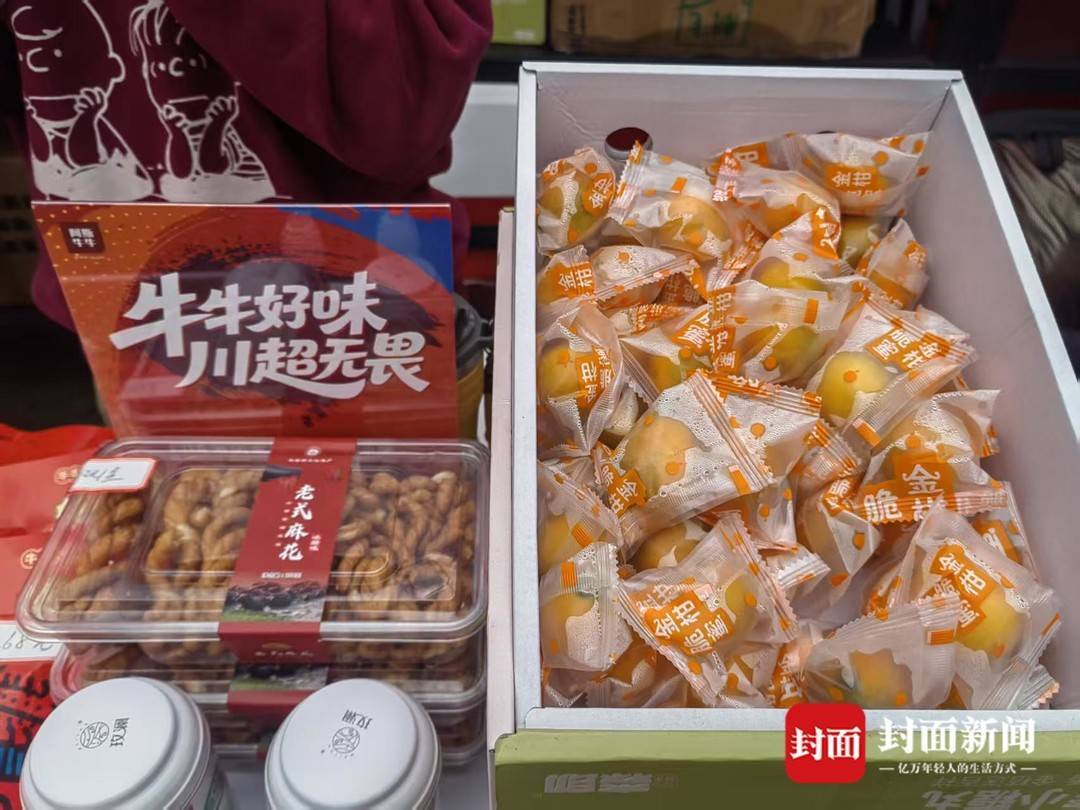 如果说这些地道美食摊位晕开了“川超嘉年华”的烟火气,那四川文旅服务集团的展位前,则是一场更加系统的“地方好物大集合”。凉山的牛肉干、德昌脆皮金桔、南充的手工麻花和玫瑰花系列产品……四川不少市州的特色农产品在这里整齐陈列,以伴手礼的形式呈现在球迷面前。