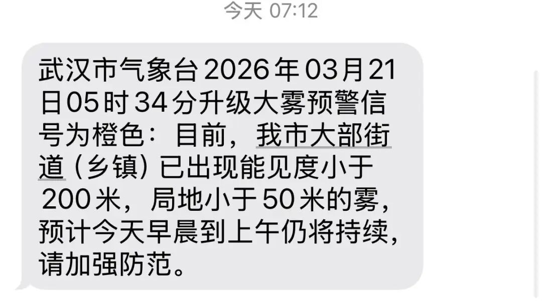 20日15点30分至21日9点53分,全省共发布116条大雾预警,其中橙红色预警57条,武汉、黄石、荆门、黄梅等多地升级为大雾橙色预警。武汉市气象台于05时34分发布大雾橙色预警,显示城区已出现能见度小于200米、局地不足50米的浓雾。