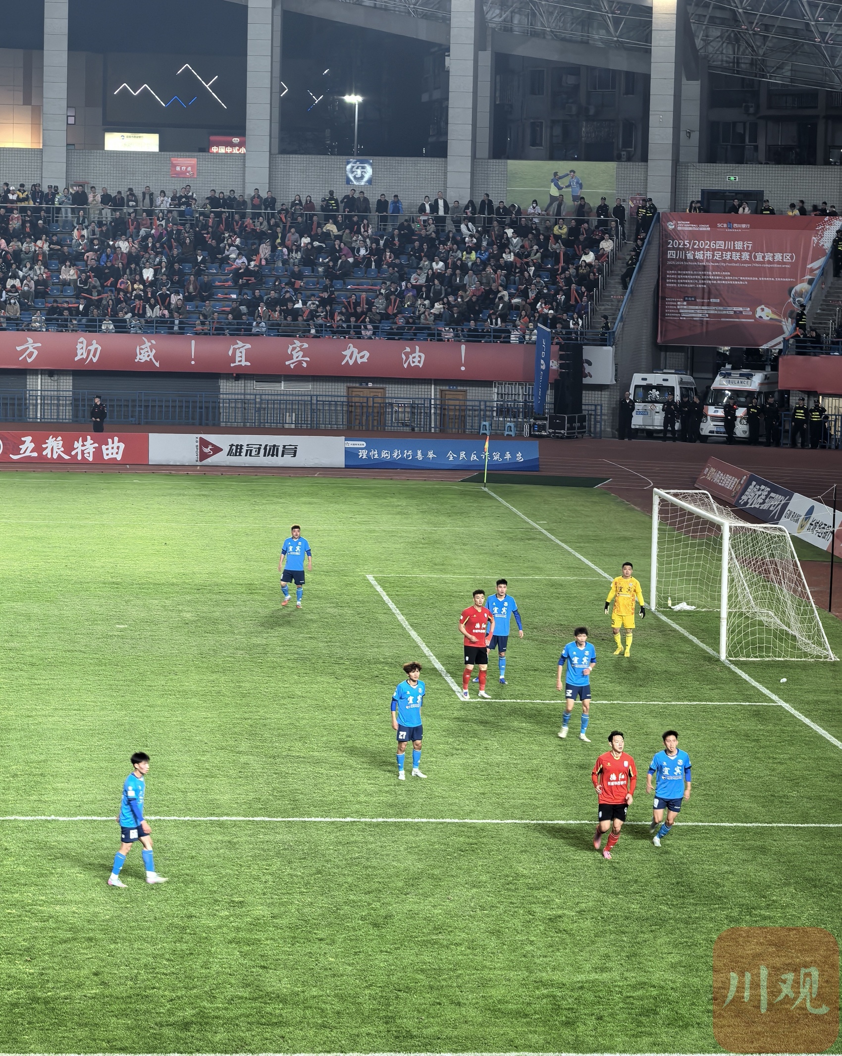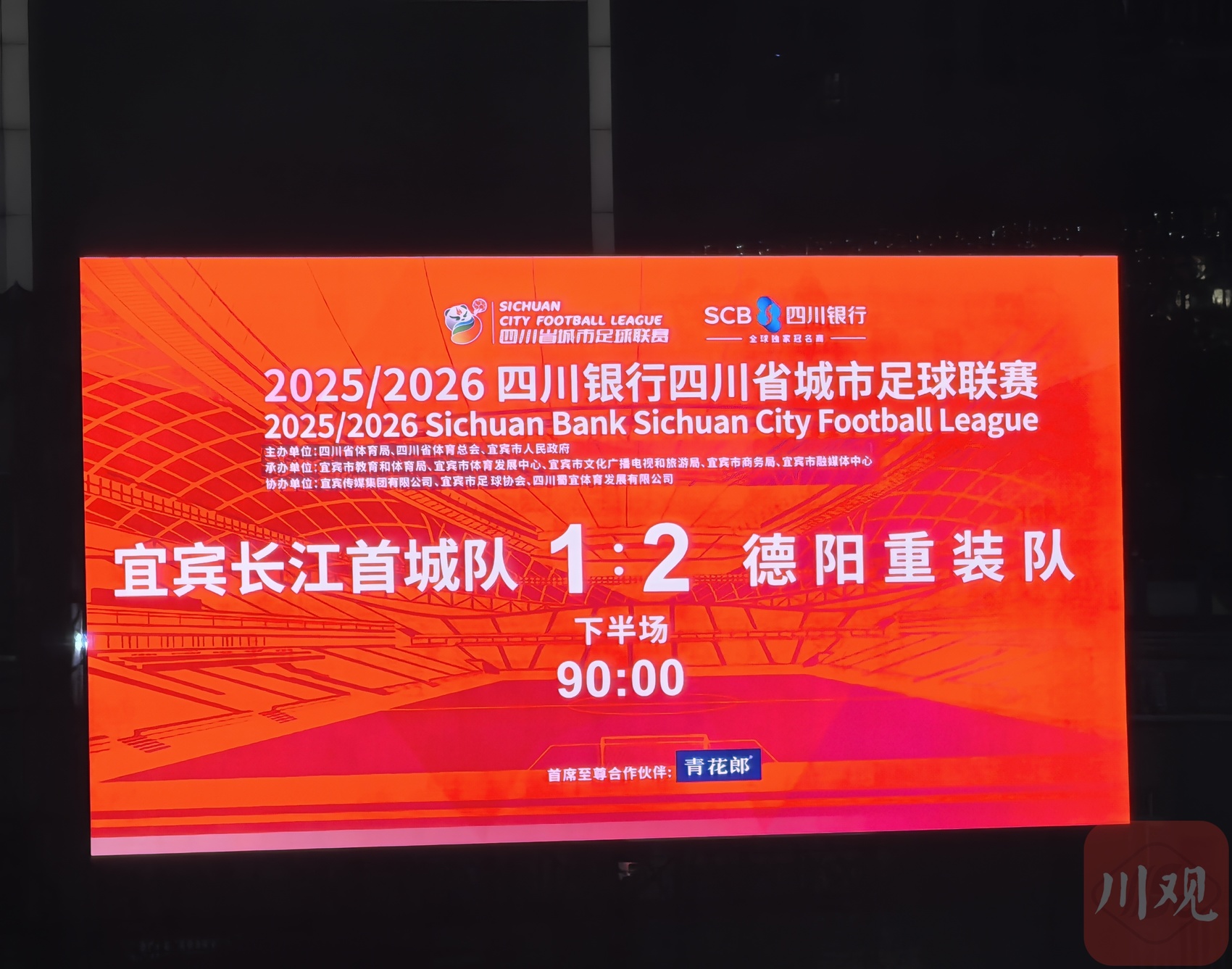 3月21日晚,2025/2026四川省城市足球联赛(简称“川超”)决赛阶段第二轮比赛在宜宾市南岸体育中心打响。宜宾长江首城队坐镇主场,迎战德阳重装队。经过90分钟的比赛,宜宾队以1:2惜败对手。