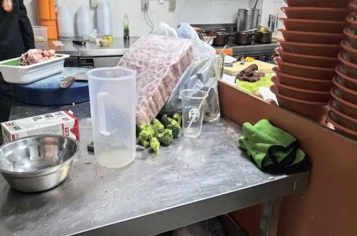 存在问题:操作台面上摆放水杯等个人用品;操作间物品摆放杂乱,未按规定分区整理;冷柜内生食、熟食及半成品未分开存放,未做到严格分区。