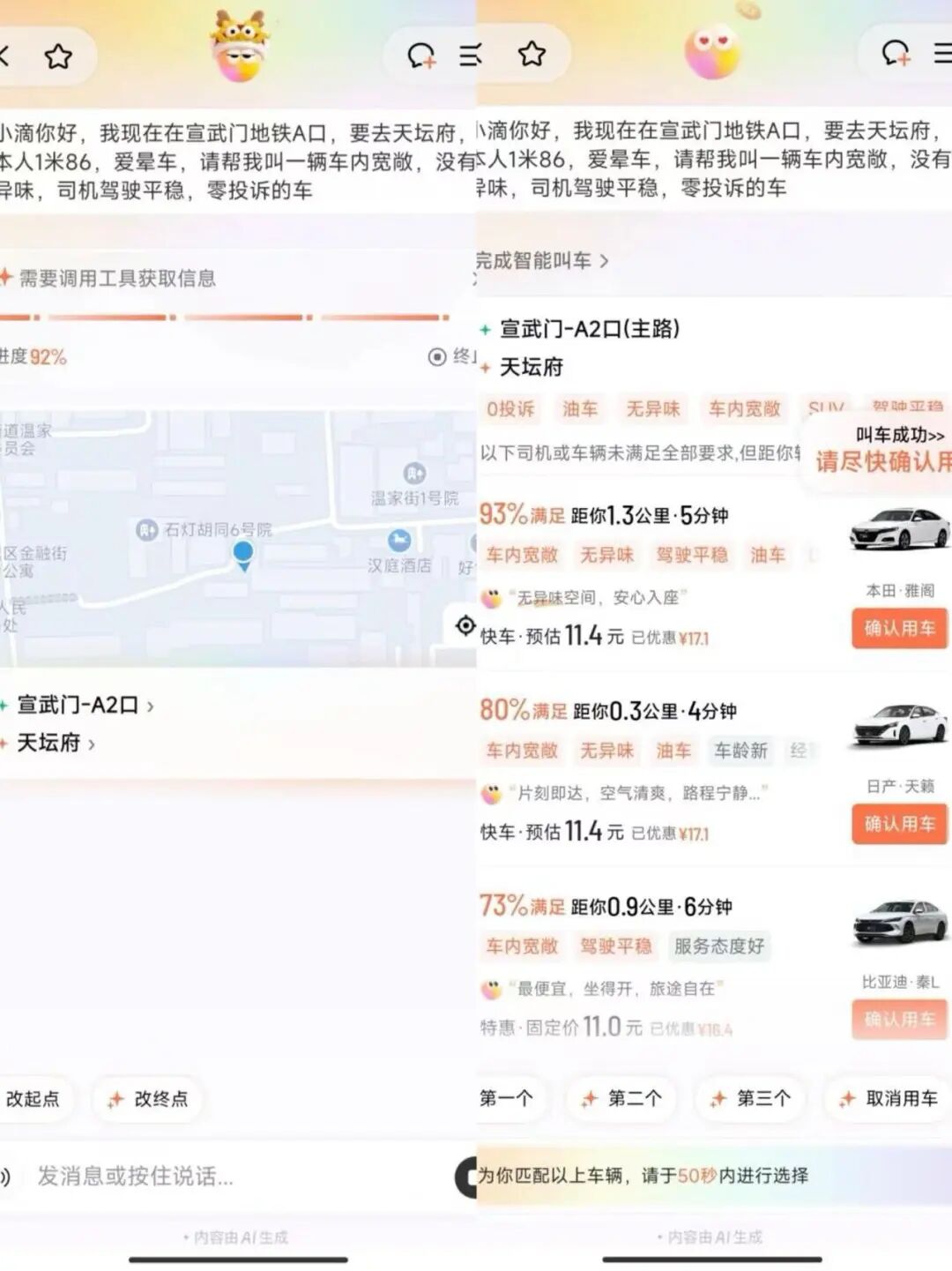 “小滴你好,我现在在宣武门地铁A口,要去天坛府。本人身高1米86,爱晕车,请帮我叫一辆车内宽敞、无异味、司机驾驶平稳且零投诉的车。”近日,北京市民小张体验了滴滴的AI叫车功能。口令发出后,小滴迅速响应,筛选出匹配度分别为93%、80%、73%的多辆网约车,小张确认用车后,很快就叫到了符合需求的车型。