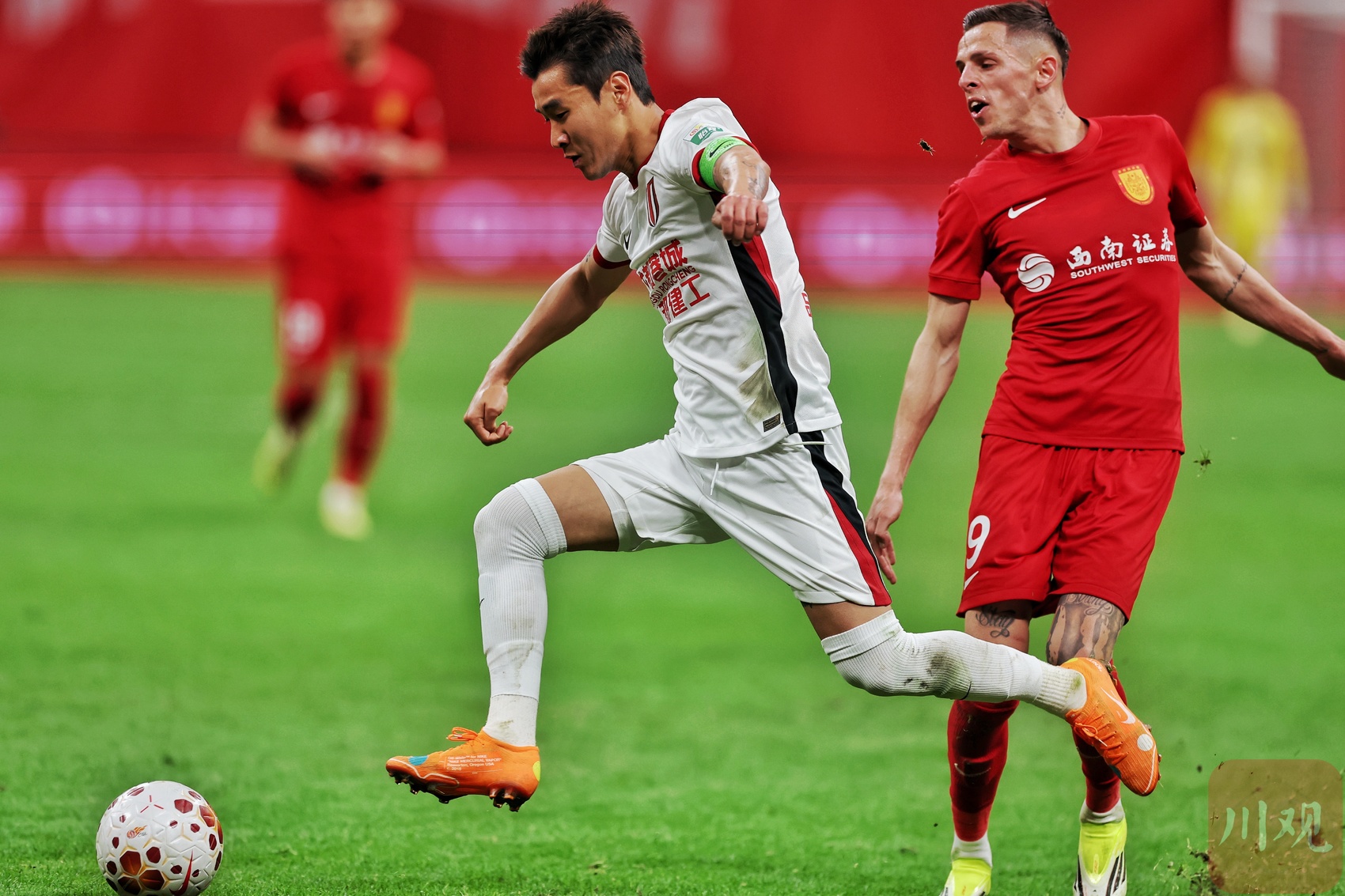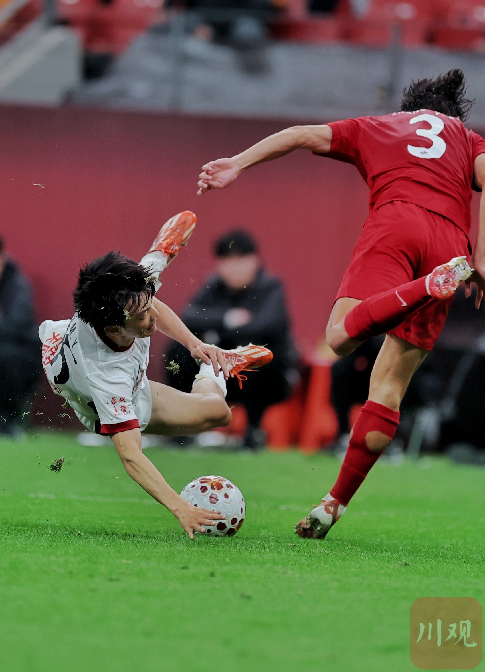 成都蓉城队员杨明洋(白衣)与对手硬拼。