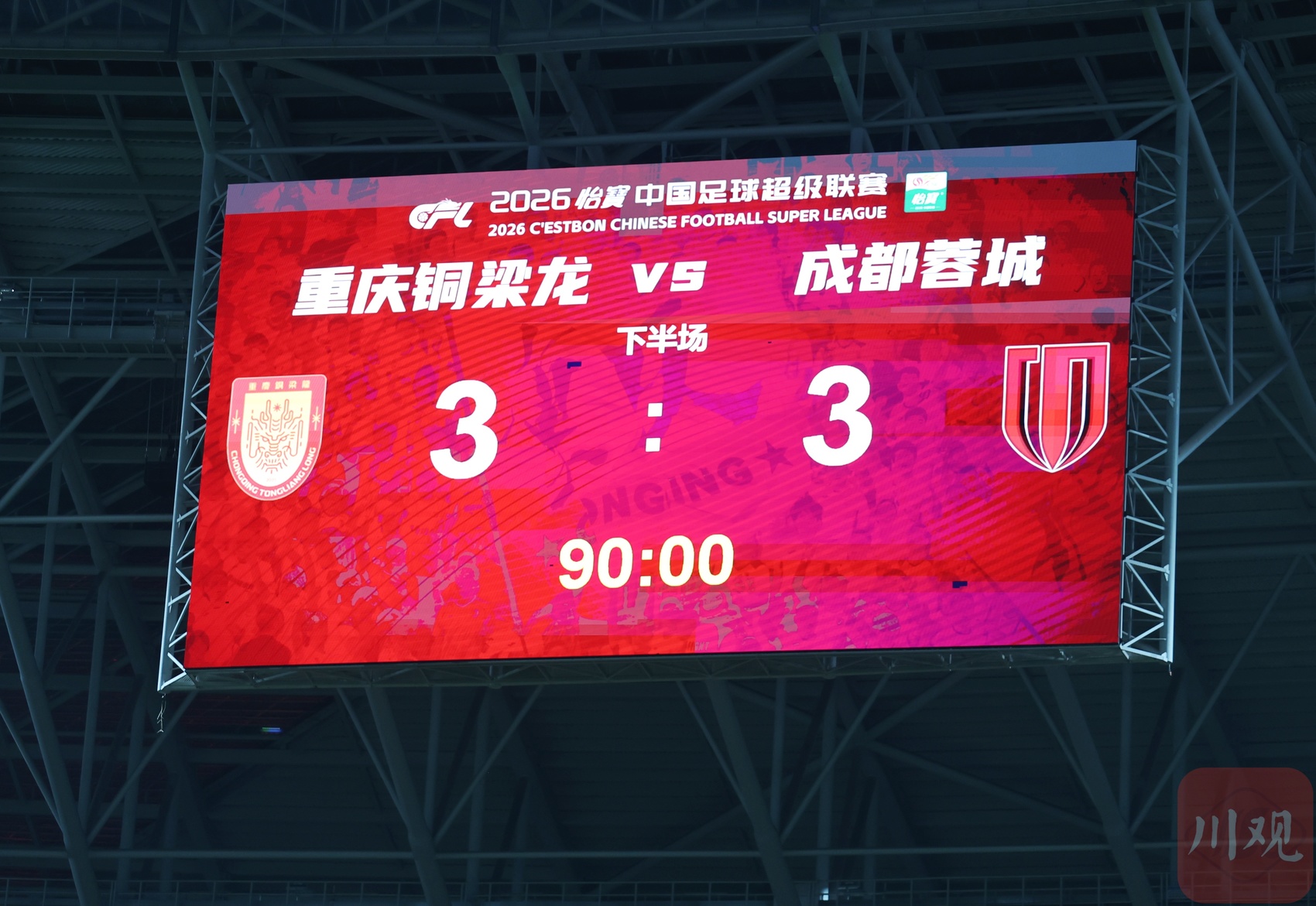3月21日,2026赛季中超联赛第三轮焦点战在重庆上演,时隔17年重返中超赛场的川渝德比燃爆全场。成都蓉城客场挑战重庆铜梁龙,两队联手奉献了一场跌宕起伏的攻防大战,最终以3比3握手言和。成都蓉城凭借伤停补时的绝平球,延续联赛不败纪录。
