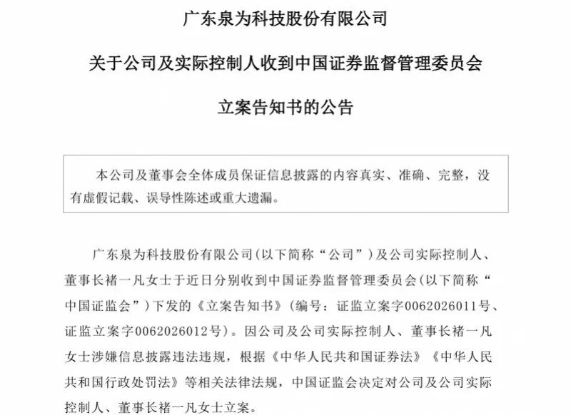 3月19日,面临退市风险的广东泉为科技股份有限公司(以下简称“ST泉为”)发布多条公告。其中,公司及公司实际控制人、董事长褚一凡于近日分别收到中国证监会下发的《立案告知书》,因涉嫌信息披露违法违规,中国证监会决定对公司及褚一凡立案。