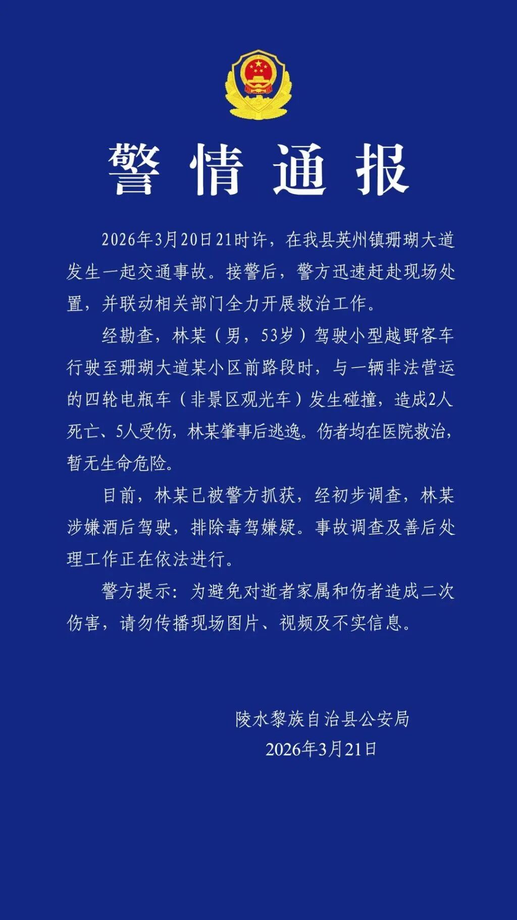 通报称,2026年3月20日21时许,在陵水县英州镇珊瑚大道发生一起交通事故。接警后,警方迅速赶赴现场处置,并联动相关部门全力开展救治工作。经勘查,林某(男,53岁)驾驶小型越野客车行驶至珊瑚大道某小区前路段时,与一辆非法营运的四轮电瓶车(非景区观光车)发生碰撞,造成2人死亡、5人受伤,林某肇事后逃逸。伤者均在医院救治,暂无生命危险。